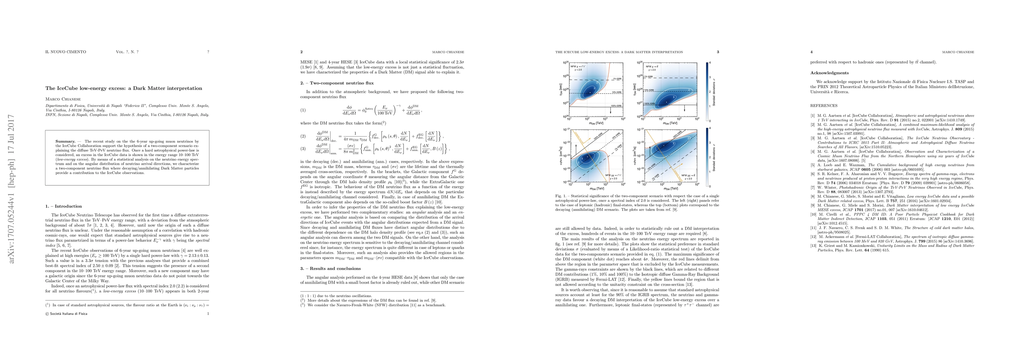 The IceCube Collaboration found a low-energy excess in neutrino data that may originate from decaying/annihilating Dark Matter particles, providing a possible explanation for the observed energy range of 10-100 TeV.