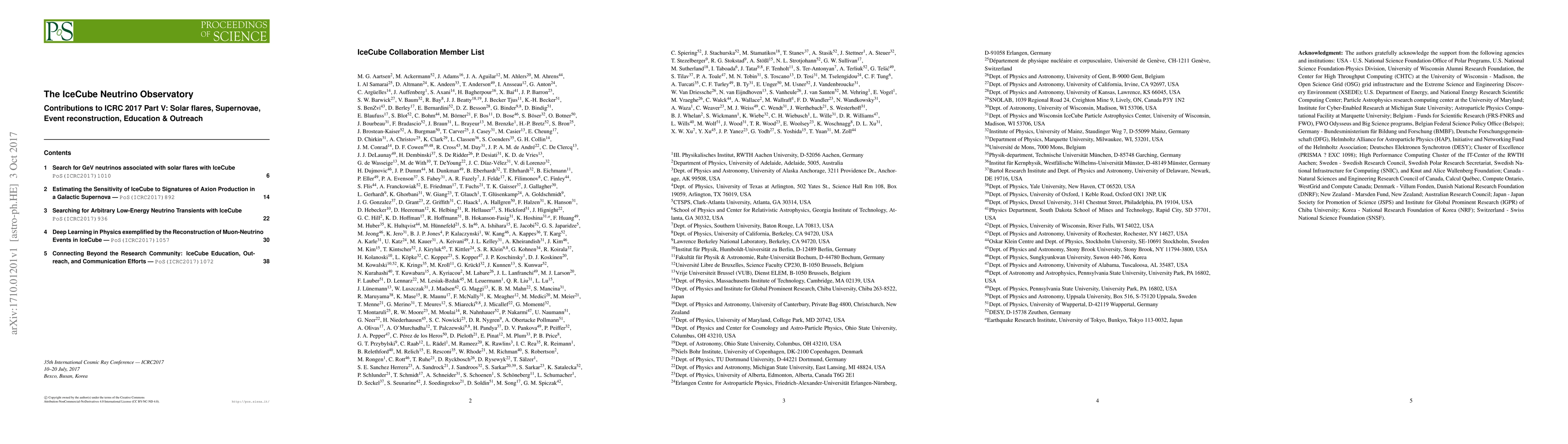 The IceCube Neutrino Observatory presented research on solar flares, supernovae, and event reconstruction at the 35th International Cosmic Ray Conference (ICRC 2017). Additionally, the collaboration highlighted its educational outreach initiatives.