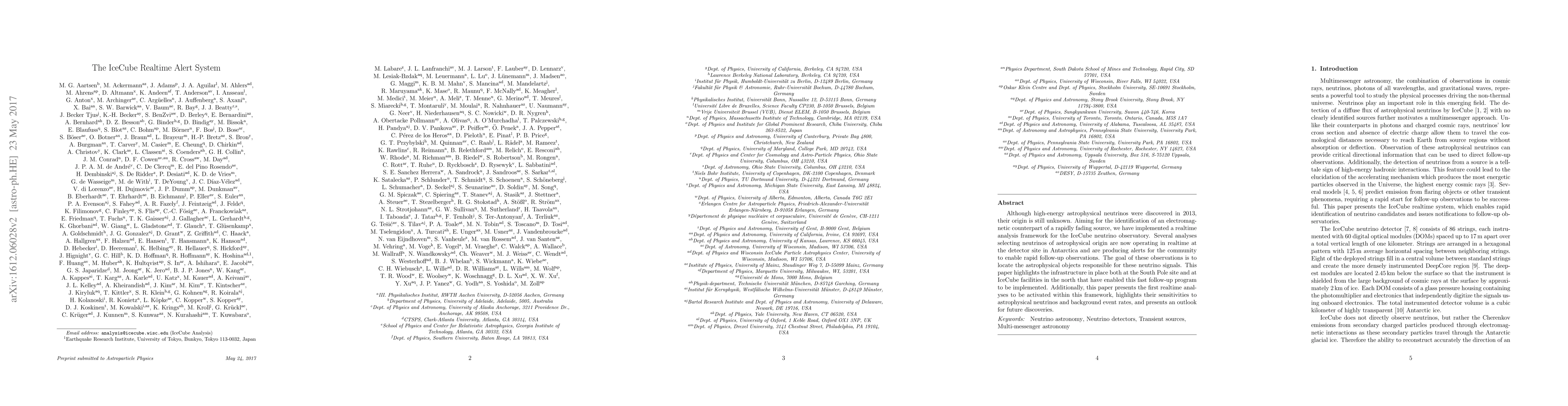 The paper presents the design, implementation, and performance of the IceCube realtime alert system, including the infrastructure, analyses, and alert generation processes for astrophysical neutrino detection.
