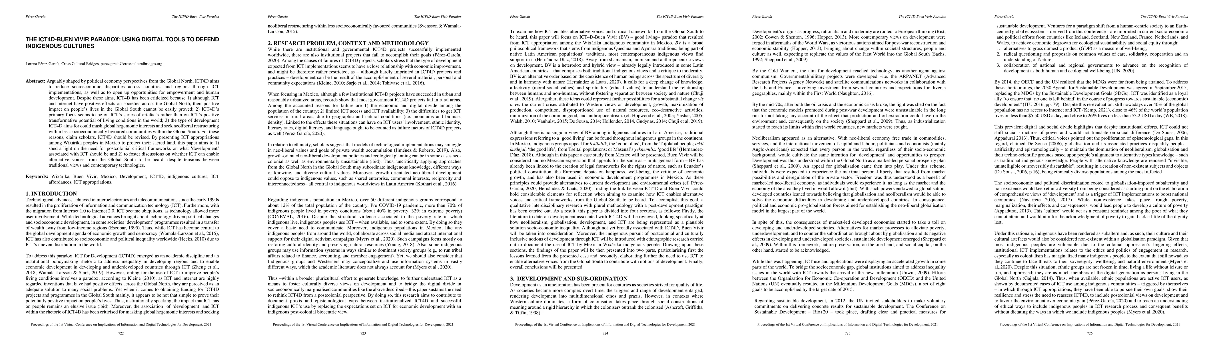 Arguably shaped by political economy perspectives from the Global North, ICT4D aims to reduce socioeconomic disparities across countries and regions through ICT implementations, as well as to open up opportunities for empowerment and human development. Despite these aims, ICT4D has been criticized because 1) although ICT and internet have positive effects on societies across the Global North, their positive impact on people's lives in the Global South cannot be easily proved; 2) ICT4D's primary focus seems to be on ICT's series of artefacts rather than on ICT's positive transformative potential of living conditions in the world; 3) the type of development ICT4D aims for could mask global hegemonic interests and seek neoliberal restructuring within less socioeconomically favoured communities within the Global South. For these reasons, claim scholars, ICT4D should be revised. By presenting ICT appropriations among Wixarika peoples in Mexico to protect their sacred land, this paper aims to 1) shed a light on the need for postcolonial critical frameworks on what 'development' associated with ICT should be and 2) to foster discussions on whether ICT can enable alternative voices from the Global South to be heard, despite tensions between traditional views and contemporary technologies.