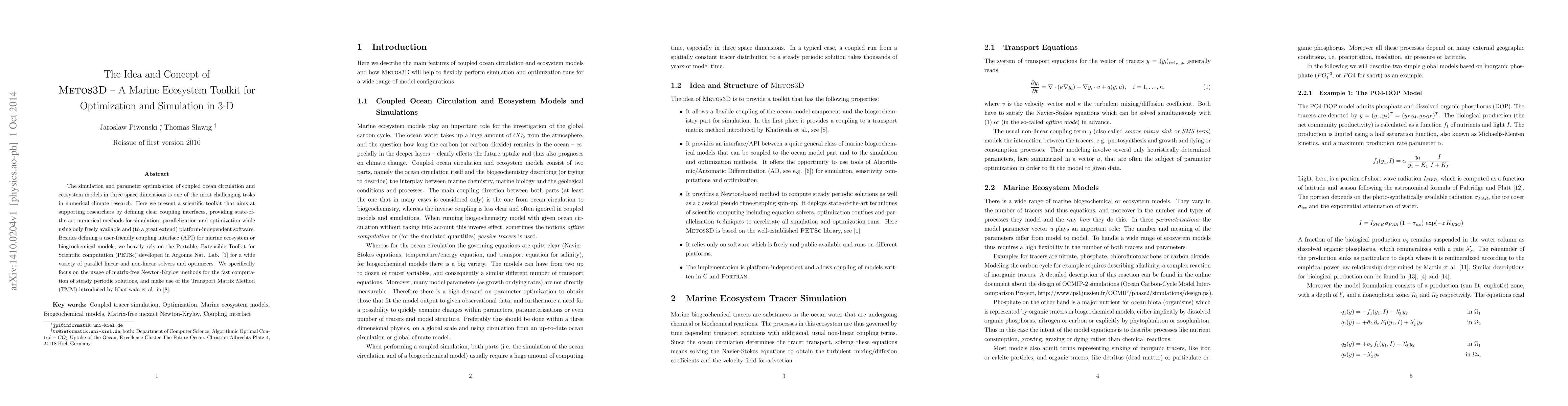 The simulation and parameter optimization of coupled ocean circulation and ecosystem models in three space dimensions is one of the most challenging tasks in numerical climate research. Here we present a scientific toolkit that aims at supporting researchers by defining clear coupling interfaces, providing state-of-the-art numerical methods for simulation, parallelization and optimization while using only freely available and (to a great extend) platform-independent software. Besides defining a user-friendly coupling interface (API) for marine ecosystem or biogeochemical models, we heavily rely on the Portable, Extensible Toolkit for Scientific computation (PETSc) developed at Argonne Nat. Lab. for a wide variety of parallel linear and non-linear solvers and optimizers. We specifically focus on the usage of matrix-free Newton-Krylov methods for the fast computation of steady periodic solutions, and make use of the Transport Matrix Method (TMM) introduced by Khatiwala et al.