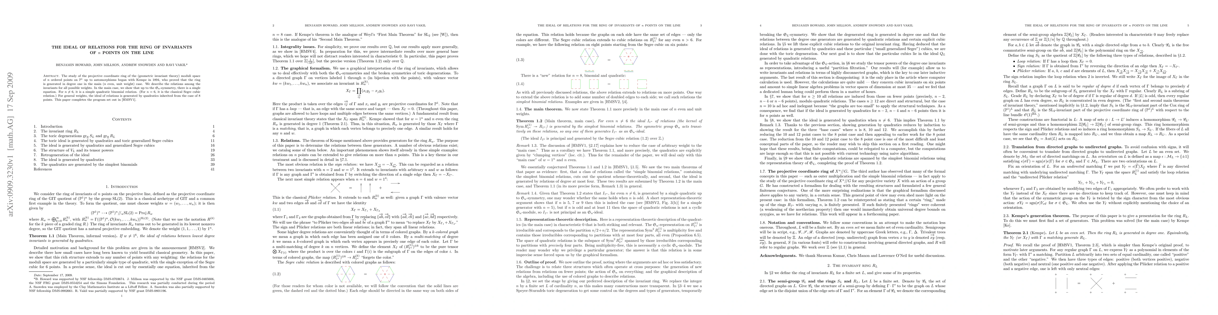 The study of the projective coordinate ring of the (geometric invariant theory) moduli space of n ordered points on P^1 up to automorphisms began with Kempe in 1894, who proved that the ring is generated in degree one in the main (n even, unit weight) case. We describe the relations among the invariants for all possible weights. In the main case, we show that up to the symmetric group symmetry, there is a single equation. For n not 6, it is a simple quadratic binomial relation. (For n=6, it is the classical Segre cubic relation.) For general weights, the ideal of relations is generated by quadratics inherited from the case of 8 points. This paper completes the program set out in [HMSV1].