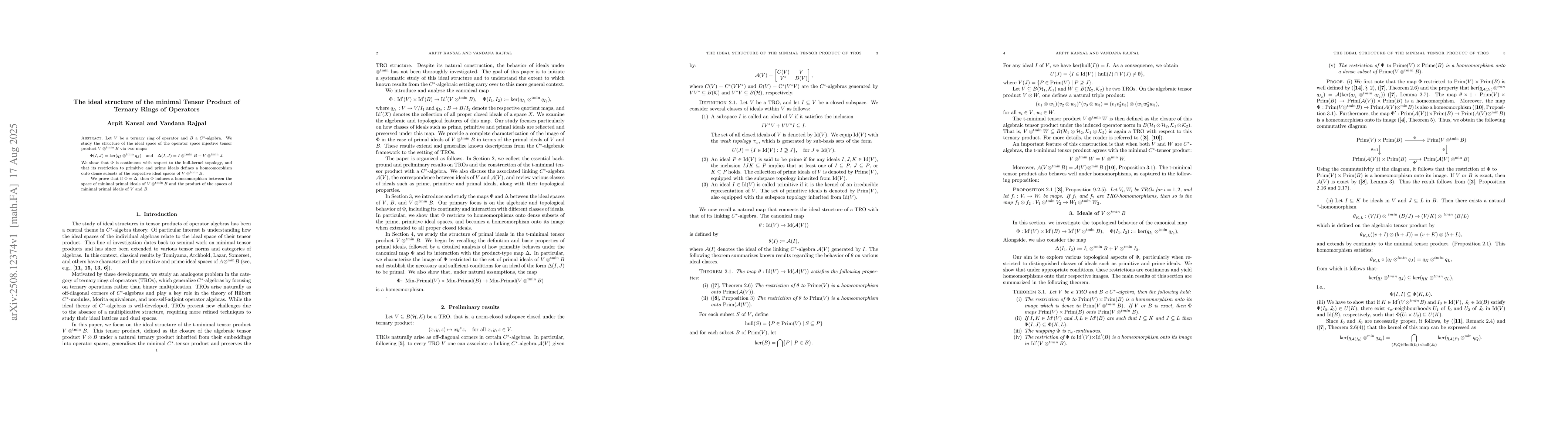 Let \( V \) be a ternary ring of operator and \( B \) a \( C^* \)-algebra. We study the structure of the ideal space of the operator space injective tensor product \( V \otimes^{\mathrm{tmin}} B \) via two maps: \[ \Phi(I, J) = \ker(q_I \otimes^{\mathrm{tmin}} q_J) \quad \text{and} \quad \Delta(I, J) = I \otimes^{\mathrm{tmin}} B + V \otimes^{\mathrm{tmin}} J. \] We show that \( \Phi \) is continuous with respect to the hull-kernel topology, and that its restriction to primitive and prime ideals defines a homeomorphism onto dense subsets of the respective ideal spaces of \( V \otimes^{\mathrm{tmin}} B \). We prove that if \( \Phi = \Delta \), then \( \Phi \) induces a homeomorphism between the space of minimal primal ideals of \( V \otimes^{\mathrm{tmin}} B \) and the product of the spaces of minimal primal ideals of \( V \) and \( B \)