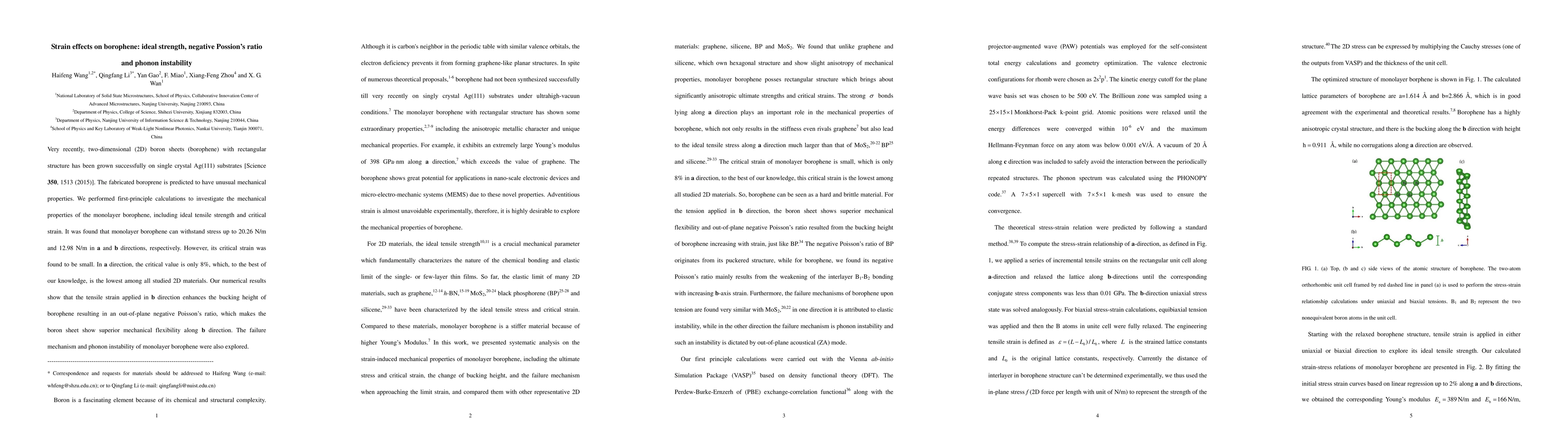 Very recently, two-dimensional(2D) boron sheets (borophene) with rectangular structure has been grown successfully on single crystal Ag(111) substrates.The fabricated boroprene is predicted to have unusual mechanical properties. We performed first-principle calculations to investigate the mechanical properties of the monolayer borophene, including ideal tensile strength and critical strain. It was found that monolayer borophene can withstand stress up to 20.26 N/m and 12.98 N/m in a and b directions, respectively.However, its critical strain was found to be small. In a direction, the critical value is only 8%, which, to the best of our knowledge, is the lowest among all studied 2D materials.Our numerical results show that the tensile strain applied in b direction enhances the bucking height of borophene resulting in an out-of-plane negative Poisson's ratio, which makes the boron sheet show superior mechanical flexibility along b direction.The failure mechanism and phonon instability of monolayer borophene were also explored.