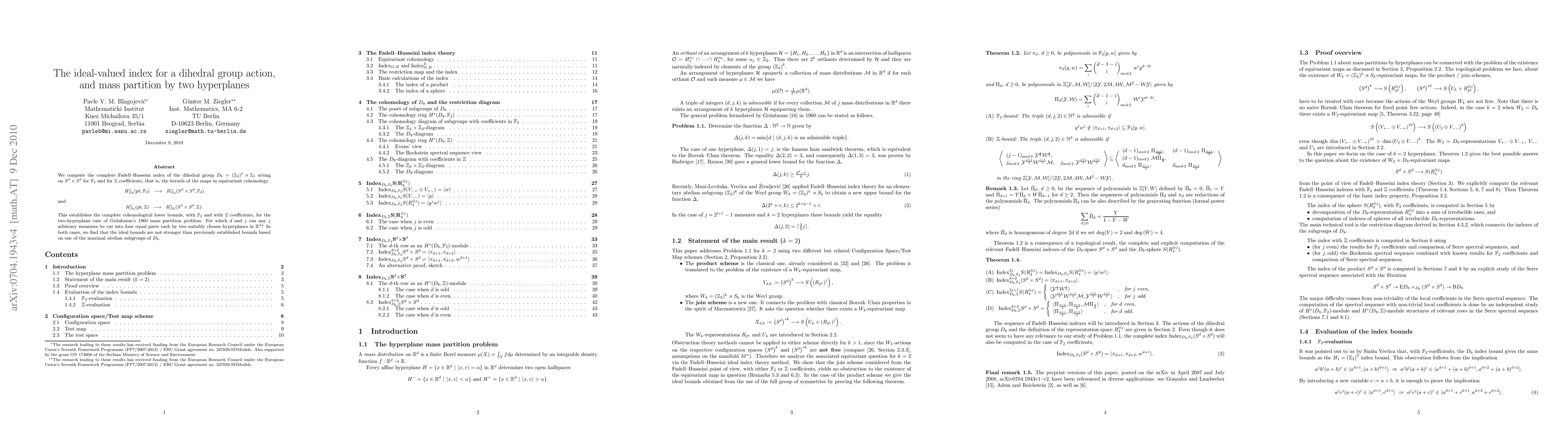 Researchers computed the ideal-valued index for a dihedral group action on 2D space, solving Grunbaum's mass partition problem for certain hyperplane cases.