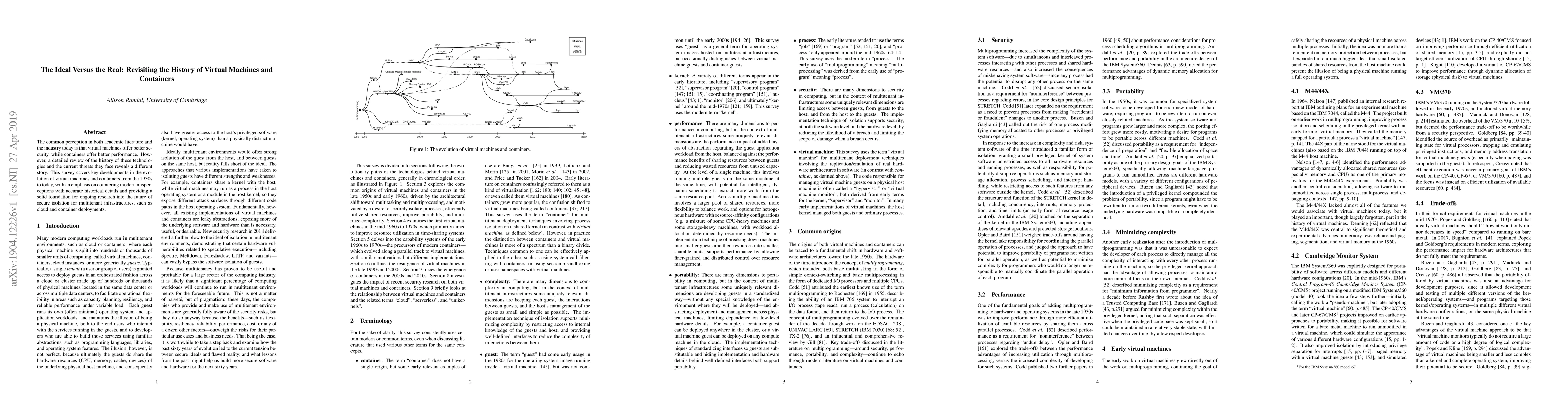The paper provides a detailed historical review of virtual machines and containers, analyzing their evolution from the 1950s to the present, with a focus on dispelling misconceptions about their security and performance.