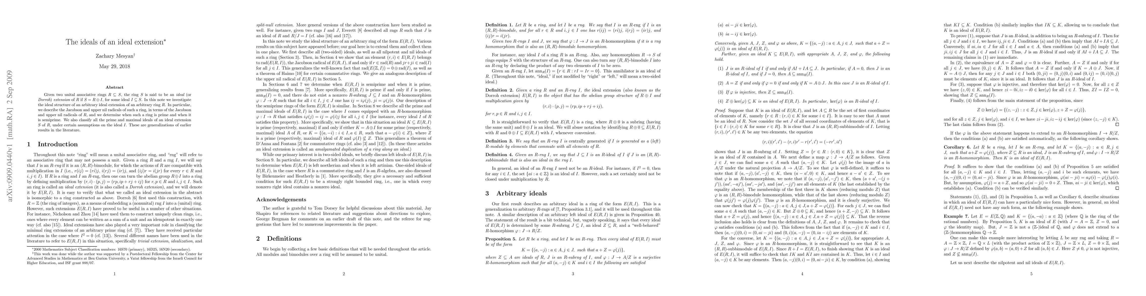 Given a unital associative ring S and a subring R, we say that S is an ideal (or Dorroh) extension of R if for some ideal I of S, S = R + I, where the sum is direct. In this note we investigate the ideal structure of an arbitrary ideal extension of an arbitrary ring R. In particular, we describe the Jacobson and upper nil radicals of such a ring, in terms of the Jacobson and upper nil radicals of R, and we determine when such a ring is prime and when it is semiprime. We also classify all the prime and maximal ideals of an ideal extension S of R, under certain assumptions on the ideal I. These are generalizations of earlier results in the literature.