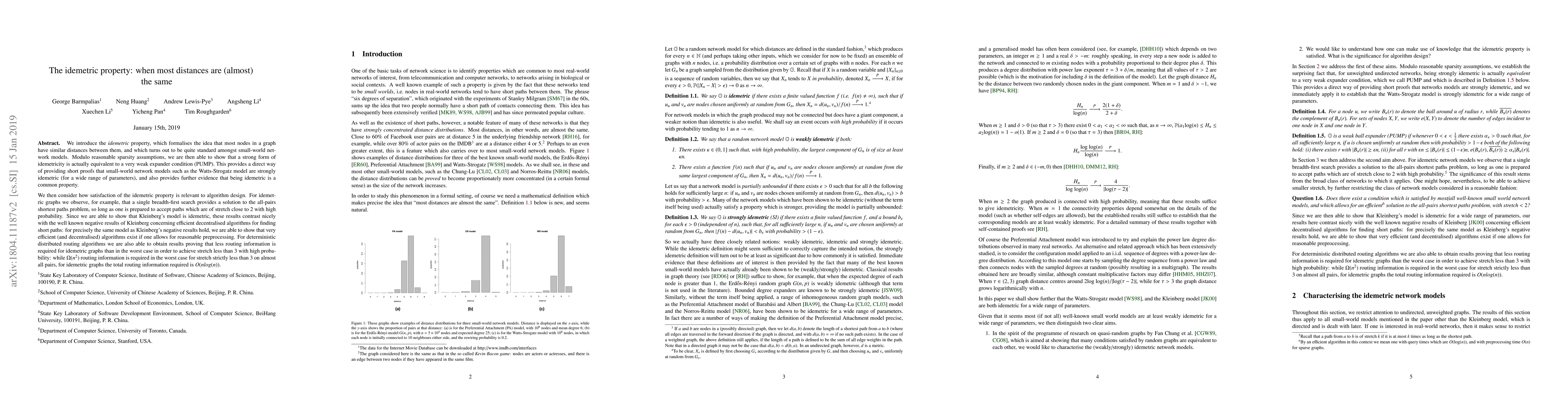 We introduce the \emph{idemetric} property, which formalises the idea that most nodes in a graph have similar distances between them, and which turns out to be quite standard amongst small-world network models. Modulo reasonable sparsity assumptions, we are then able to show that a strong form of idemetricity is actually equivalent to a very weak expander condition (PUMP). This provides a direct way of providing short proofs that small-world network models such as the Watts-Strogatz model are strongly idemetric (for a wide range of parameters), and also provides further evidence that being idemetric is a common property. We then consider how satisfaction of the idemetric property is relevant to algorithm design. For idemetric graphs we observe, for example, that a single breadth-first search provides a solution to the all-pairs shortest paths problem, so long as one is prepared to accept paths which are of stretch close to 2 with high probability. Since we are able to show that Kleinberg's model is idemetric, these results contrast nicely with the well known negative results of Kleinberg concerning efficient decentralised algorithms for finding short paths: for precisely the same model as Kleinberg's negative results hold, we are able to show that very efficient (and decentralised) algorithms exist if one allows for reasonable preprocessing. For deterministic distributed routing algorithms we are also able to obtain results proving that less routing information is required for idemetric graphs than the worst case in order to achieve stretch less than 3 with high probability: while $\Omega(n^2)$ routing information is required in the worst case for stretch strictly less than 3 on almost all pairs, for idemetric graphs the total routing information required is $O(nlog(n))$.