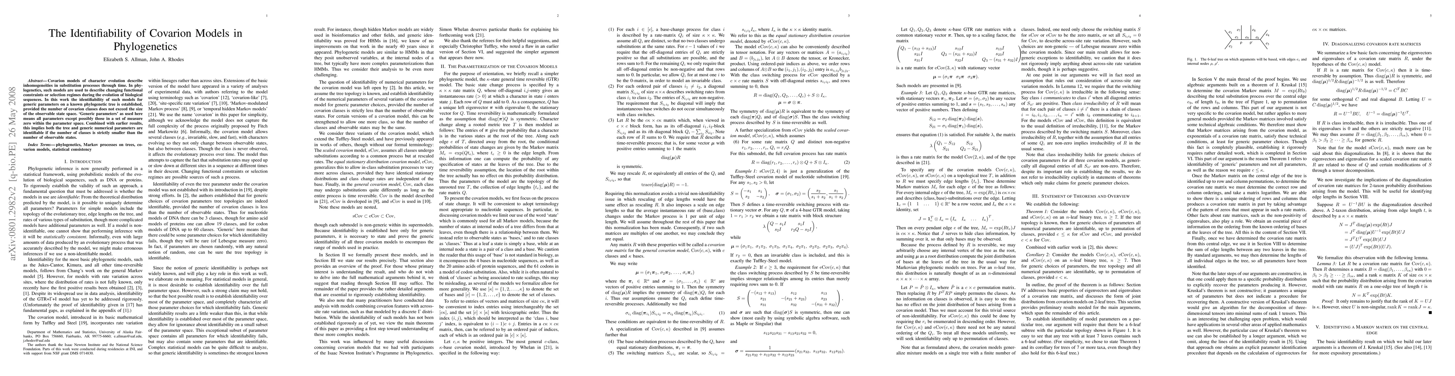This paper establishes the identifiability of covarion models in phylogenetics, showing that such models can reliably estimate parameters when the number of covarion classes is less than the size of the observable state space. This result, combined with previous findings, confirms that both the phylogenetic tree and generic numerical parameters are identifiable under these conditions.