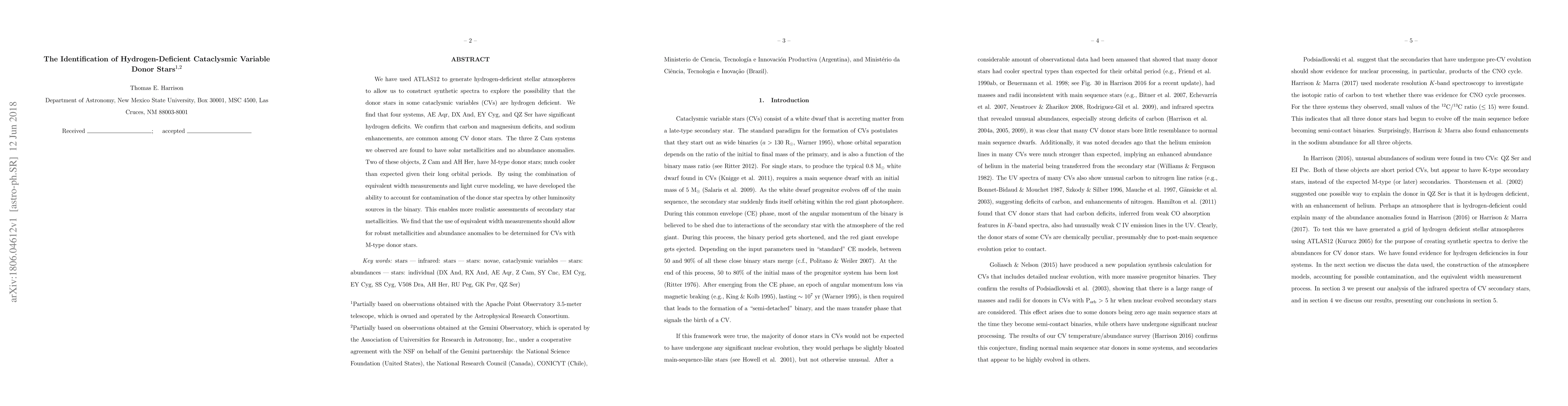 The study uses ATLAS12 to create hydrogen-deficient stellar models, identifying hydrogen deficits in AE Aqr, DX And, EY Cyg, and QZ Ser. It confirms carbon and magnesium deficits, sodium enhancements in CV donor stars. The research also finds solar metallicities and no anomalies in three Z Cam systems. M-type donor stars in Z Cam and AH Her are cooler than expected. The methodology combines equivalent width measurements and light curve modeling to assess donor star metallicities, enabling robust determination of metallicities and abundance anomalies in CVs with M-type donor stars.