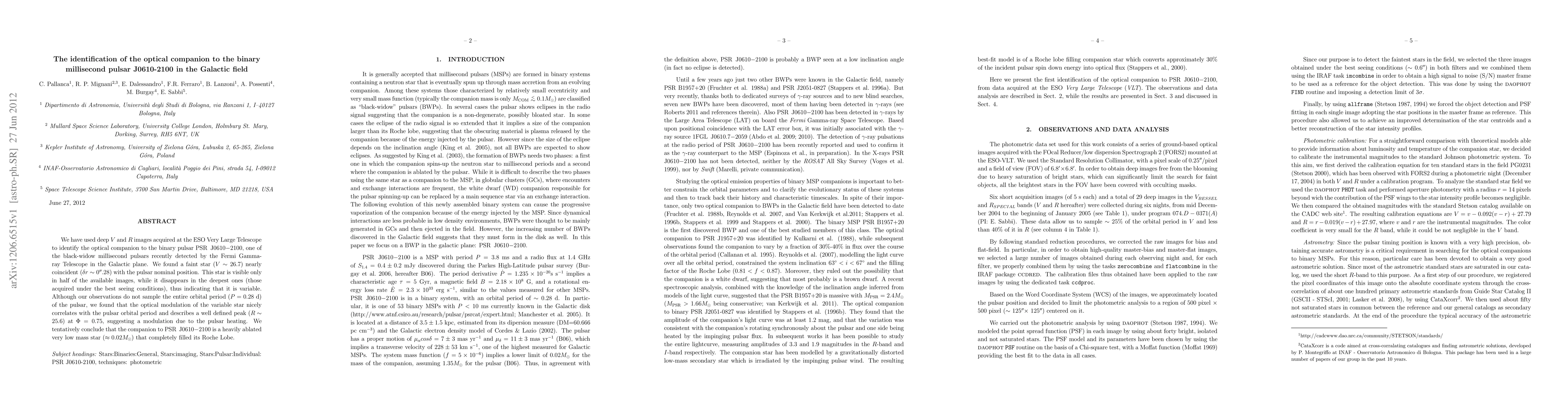 Researchers identified the optical companion of the binary millisecond pulsar PSR J0610-2100 using deep VLT V and R images. The companion, a faint variable star (~26.7 mag), shows modulation correlating with the pulsar's 0.28-day orbital period, suggesting it's a heavily ablated low-mass star (~0.02 Msun) that has filled its Roche Lobe.