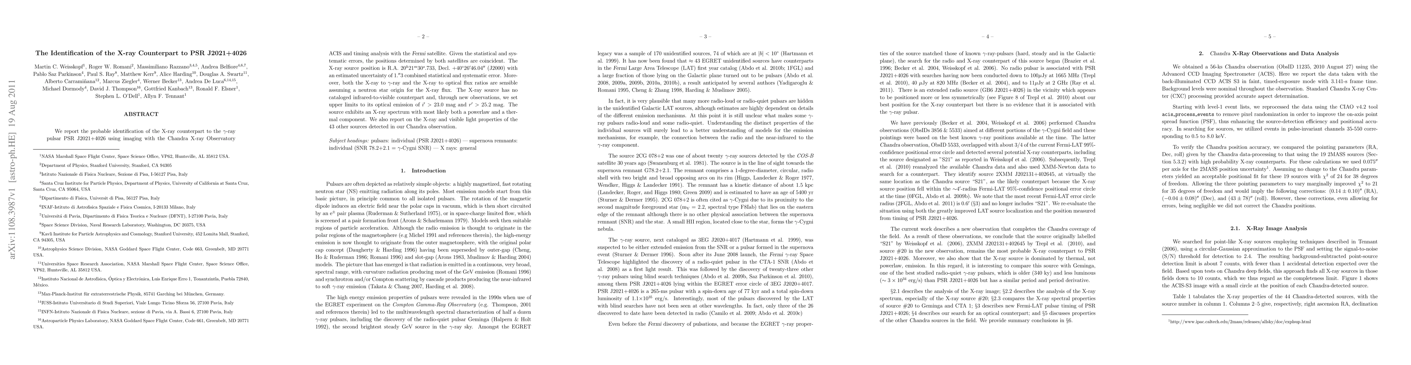 The research paper identifies a probable X-ray counterpart to gamma-ray pulsar PSR J2021+4026 using Chandra Observatory data and Fermi satellite timing analysis, revealing a neutron star origin for the X-ray flux with an X-ray spectrum showing both powerlaw and thermal components.