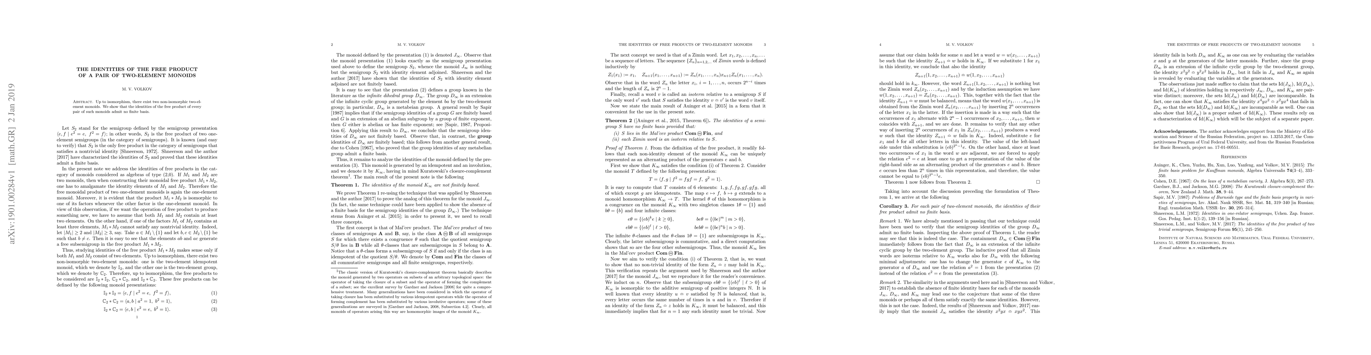 Up to isomorphism, there exist two non-isomorphic two-element monoids. We show that the identities of the free product of every pair of such monoids admit no finite basis.
