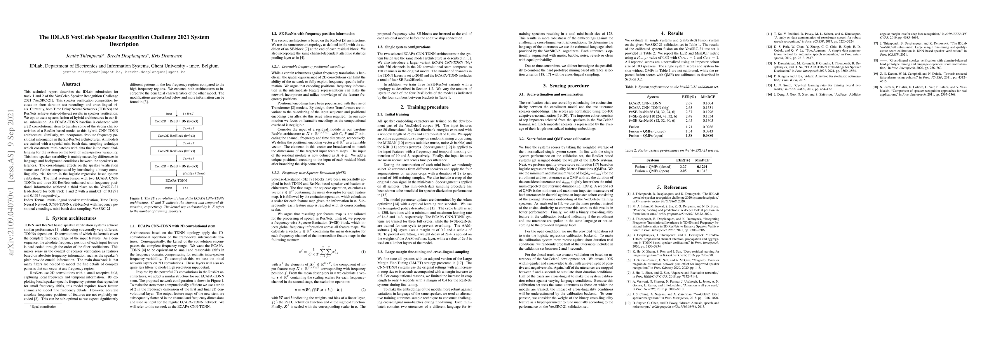 This technical report describes the IDLab submission for track 1 and 2 of the VoxCeleb Speaker Recognition Challenge 2021 (VoxSRC-21). This speaker verification competition focuses on short duration test recordings and cross-lingual trials. Currently, both Time Delay Neural Networks (TDNNs) and ResNets achieve state-of-the-art results in speaker verification. We opt to use a system fusion of hybrid architectures in our final submission. An ECAPA-TDNN baseline is enhanced with a 2D convolutional stem to transfer some of the strong characteristics of a ResNet based model to this hybrid CNN-TDNN architecture. Similarly, we incorporate absolute frequency positional information in the SE-ResNet architectures. All models are trained with a special mini-batch data sampling technique which constructs mini-batches with data that is the most challenging for the system on the level of intra-speaker variability. This intra-speaker variability is mainly caused by differences in language and background conditions between the speaker's utterances. The cross-lingual effects on the speaker verification scores are further compensated by introducing a binary cross-linguality trial feature in the logistic regression based system calibration. The final system fusion with two ECAPA CNN-TDNNs and three SE-ResNets enhanced with frequency positional information achieved a third place on the VoxSRC-21 leaderboard for both track 1 and 2 with a minDCF of 0.1291 and 0.1313 respectively.