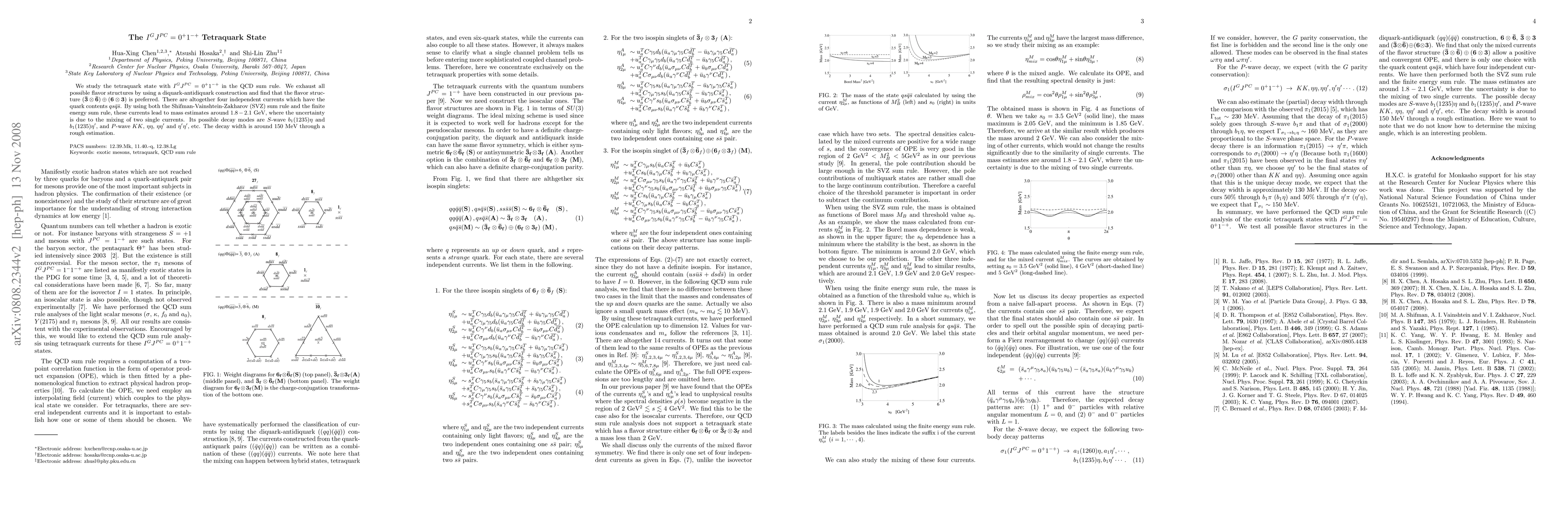 We study the tetraquark state with I^G J^{PC} = 0^+ 1^{-+} in the QCD sum rule. We exhaust all possible flavor structures by using a diquark-antidiquark construction and find that the flavor structure 3*6+6*3 is preferred. There are altogether four independent currents which have the quark contents q s \bar q \bar s. By using both the Shifman-Vainshtein-Zakharov (SVZ) sum rule and the finite energy sum rule, these currents lead to mass estimates around 1.8 - 2.1 GeV, where the uncertainty is due to the mixing of two single currents. Its possible decay modes are S-wave b_1(1235) \eta and b_1(1235) \eta^\prime, and P-wave KK, \eta \eta, \eta \eta^\prime and \eta^\prime \eta^\prime, etc. The decay width is around 150 MeV through a rough estimation.