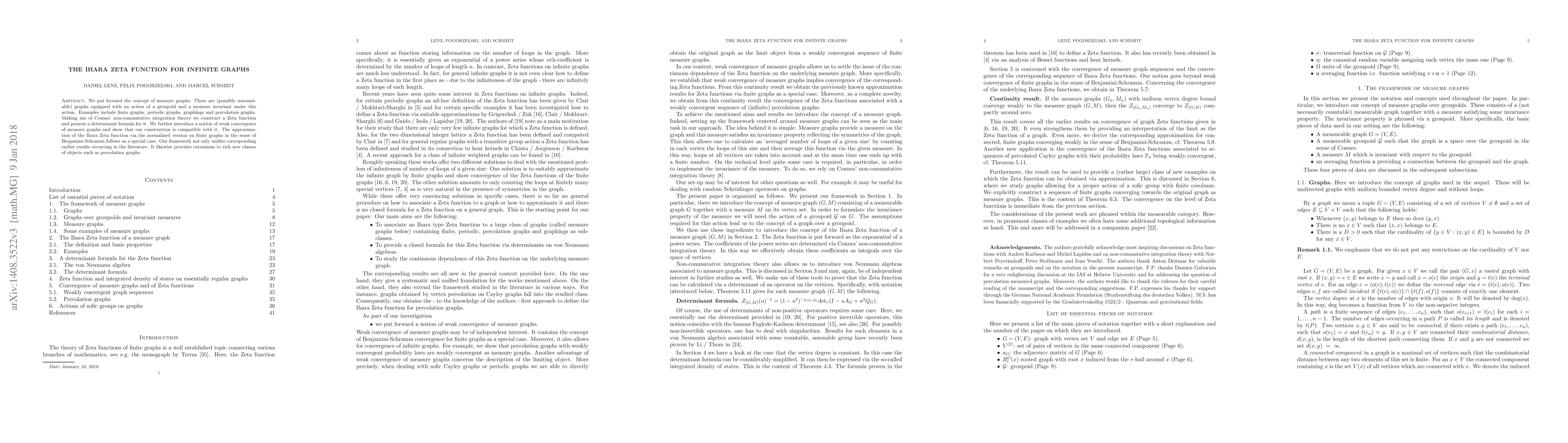 We put forward the concept of measure graphs. These are (possibly uncountable) graphs equipped with an action of a groupoid and a measure invariant under this action. Examples include finite graphs, periodic graphs, graphings and percolation graphs. Making use of Connes' non-commutative integration theory we construct a Zeta function and present a determinant formula for it. We further introduce a notion of weak convergence of measure graphs and show that our construction is compatible with it. The approximation of the Ihara Zeta function via the normalized version on finite graphs in the sense of Benjamini-Schramm follows as a special case. Our framework not only unifies corresponding earlier results occurring in the literature. It likewise provides extensions to rich new classes of objects such as percolation graphs.