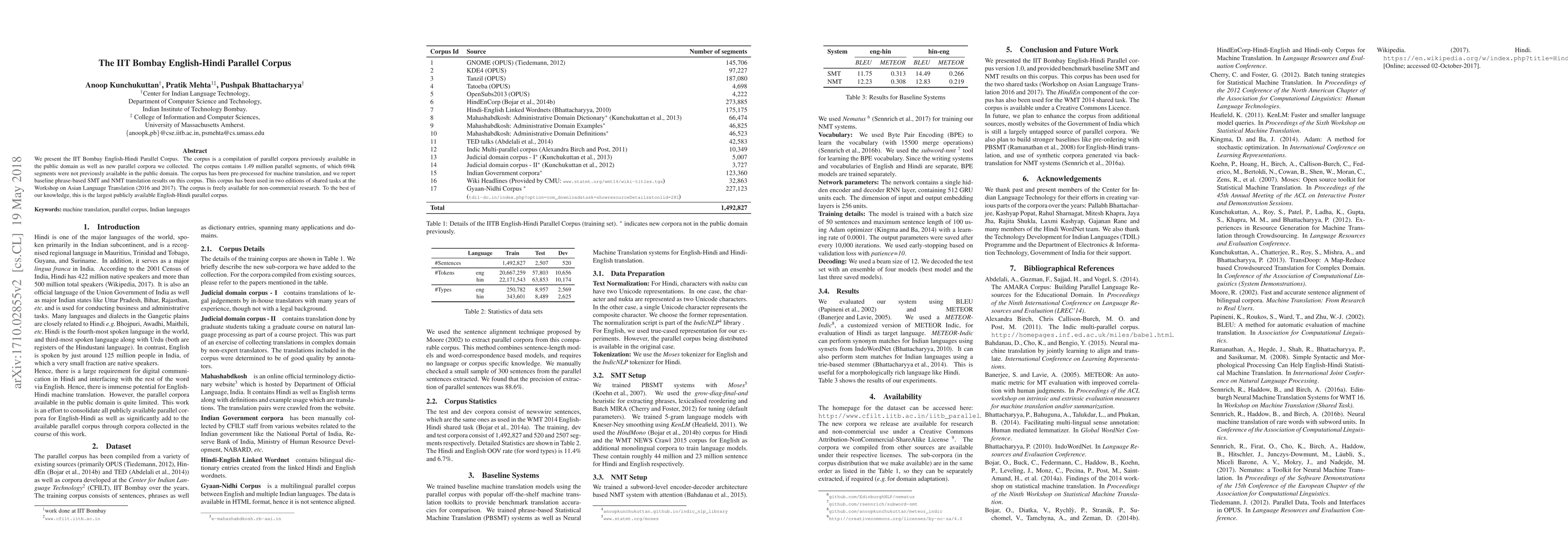 The IIT Bombay English-Hindi Parallel Corpus compiles 1.49 million parallel segments, including 694k new segments, for machine translation research. It has been used in shared tasks and is freely available for non-commercial research.