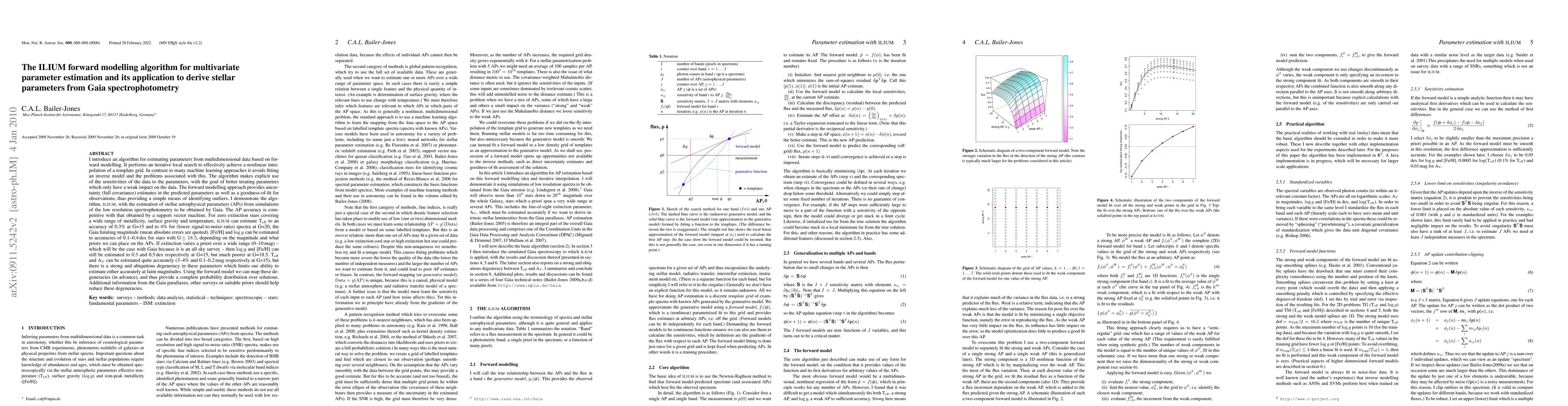 I introduce an algorithm for estimating parameters from multidimensional data based on forward modelling. In contrast to many machine learning approaches it avoids fitting an inverse model and the problems associated with this. The algorithm makes explicit use of the sensitivities of the data to the parameters, with the goal of better treating parameters which only have a weak impact on the data. The forward modelling approach provides uncertainty (full covariance) estimates in the predicted parameters as well as a goodness-of-fit for observations. I demonstrate the algorithm, ILIUM, with the estimation of stellar astrophysical parameters (APs) from simulations of the low resolution spectrophotometry to be obtained by Gaia. The AP accuracy is competitive with that obtained by a support vector machine. For example, for zero extinction stars covering a wide range of metallicity, surface gravity and temperature, ILIUM can estimate Teff to an accuracy of 0.3% at G=15 and to 4% for (lower signal-to-noise ratio) spectra at G=20. [Fe/H] and logg can be estimated to accuracies of 0.1-0.4dex for stars with G<=18.5. If extinction varies a priori over a wide range (Av=0-10mag), then Teff and Av can be estimated quite accurately (3-4% and 0.1-0.2mag respectively at G=15), but there is a strong and ubiquitous degeneracy in these parameters which limits our ability to estimate either accurately at faint magnitudes. Using the forward model we can map these degeneracies (in advance), and thus provide a complete probability distribution over solutions. (Abridged)