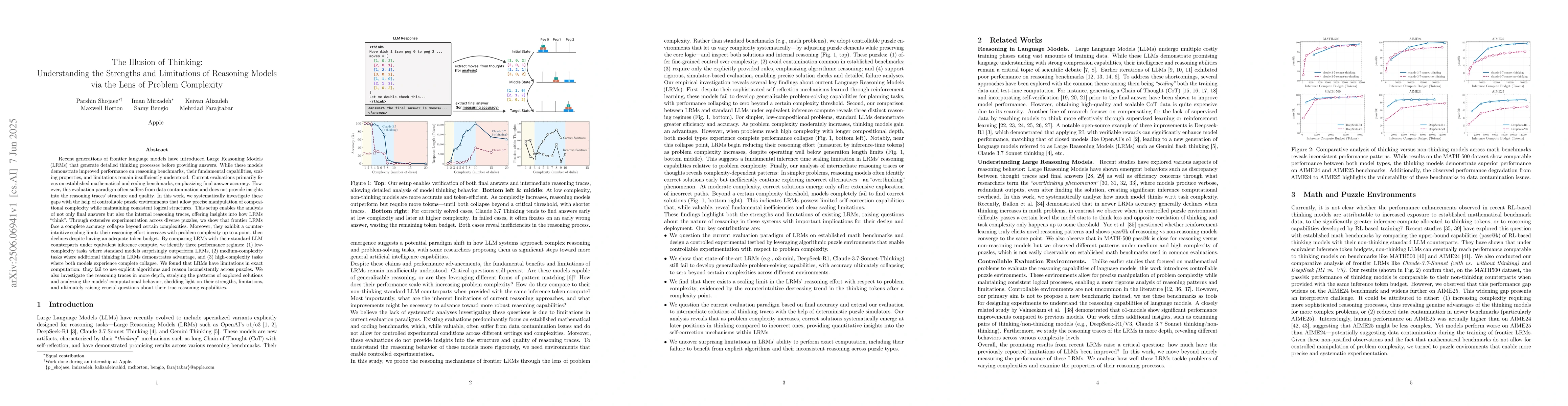 Recent generations of language models have introduced Large Reasoning Models (LRMs) that generate detailed thinking processes before providing answers. While these models demonstrate improved performance on reasoning benchmarks, their fundamental capabilities, scaling properties, and limitations remain insufficiently understood. Current evaluations primarily focus on established math and coding benchmarks, emphasizing final answer accuracy. However, this evaluation paradigm often suffers from contamination and does not provide insights into the reasoning traces. In this work, we systematically investigate these gaps with the help of controllable puzzle environments that allow precise manipulation of complexity while maintaining consistent logical structures. This setup enables the analysis of not only final answers but also the internal reasoning traces, offering insights into how LRMs think. Through extensive experiments, we show that LRMs face a complete accuracy collapse beyond certain complexities. Moreover, they exhibit a counterintuitive scaling limit: their reasoning effort increases with problem complexity up to a point, then declines despite having remaining token budget. By comparing LRMs with their standard LLM counterparts under same inference compute, we identify three performance regimes: (1) low-complexity tasks where standard models outperform LRMs, (2) medium-complexity tasks where LRMs demonstrates advantage, and (3) high-complexity tasks where both models face complete collapse. We found that LRMs have limitations in exact computation: they fail to use explicit algorithms and reason inconsistently across scales. We also investigate the reasoning traces in more depth, studying the patterns of explored solutions and analyzing the models' computational behavior, shedding light on their strengths, limitations, and raising questions about their reasoning capabilities.
