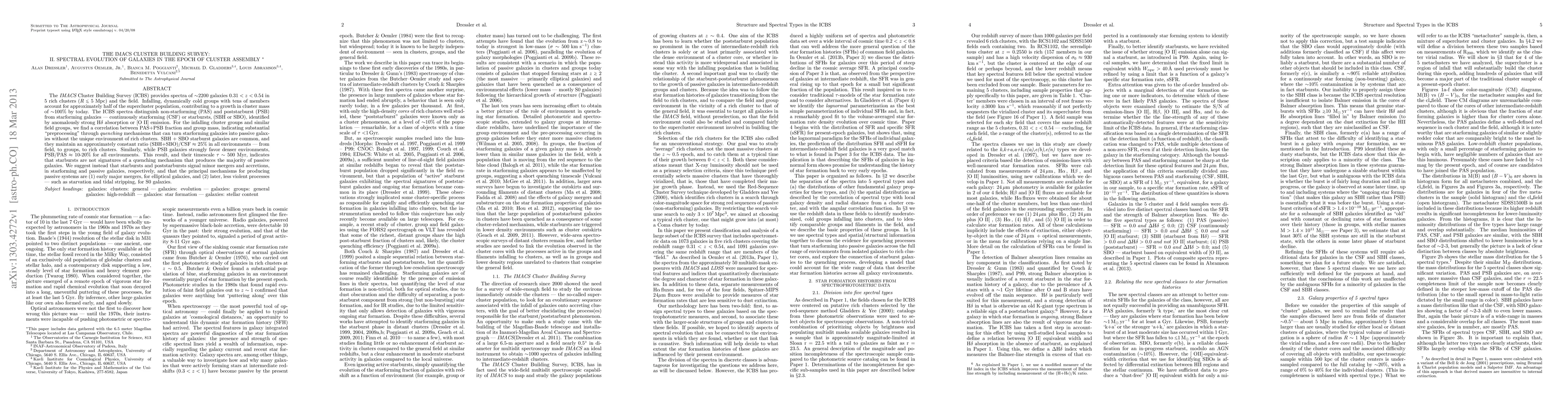 The IMACS Cluster Building Survey (ICBS) reveals the spectral evolution of galaxies during cluster assembly, showing that infalling groups contribute significantly to cluster mass growth. The study finds that passive and poststarburst galaxies correlate with group mass, indicating galaxy quenching before cluster entry, while starburst galaxies maintain a consistent ratio across environments, suggesting minor mergers as their primary cause rather than quenching mechanisms.