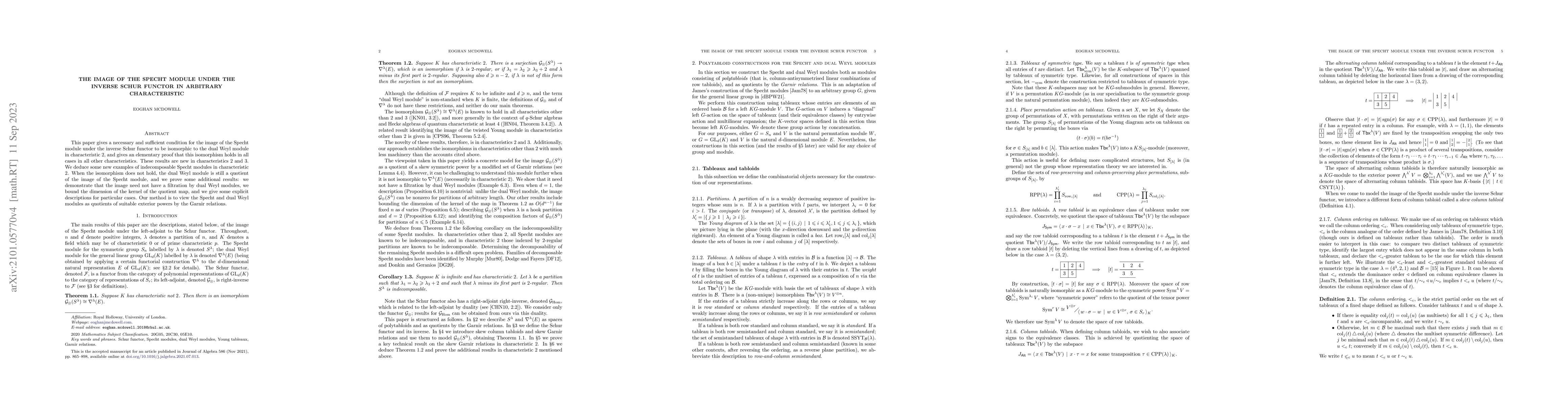This paper establishes a condition for the image of the Specht module under the inverse Schur functor to match the dual Weyl module in characteristic 2, and proves this isomorphism in all other characteristics. It also provides new examples of indecomposable Specht modules in characteristic 2 and explores cases where the isomorphism fails, offering bounds on the kernel dimension and explicit descriptions for specific scenarios.