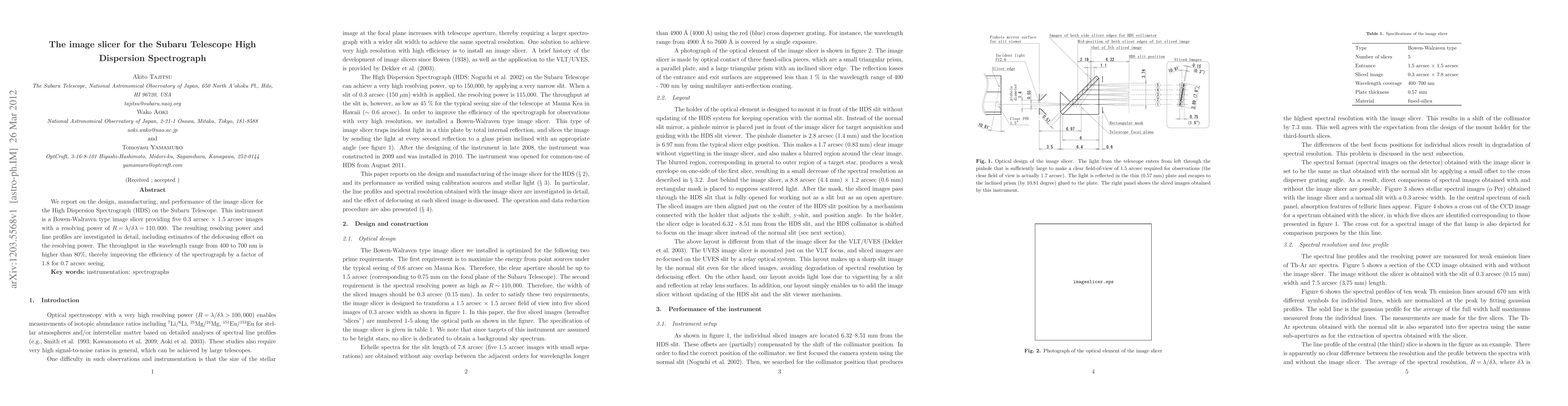 The paper details the design and performance of a Bowen-Walraven type image slicer for the Subaru Telescope's High Dispersion Spectrograph, achieving a resolving power of R=110,000 and a throughput efficiency of over 80% in the 400-700 nm range. The study also examines the impact of defocusing on resolving power.