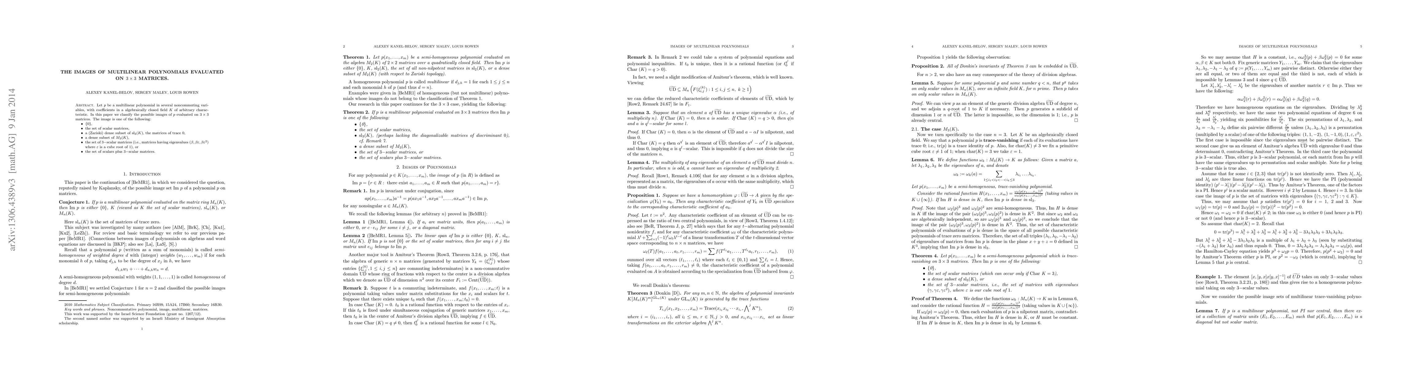 Let $p$ be a multilinear polynomial in several noncommuting variables, with coefficients in a algebraically closed field $K$ of arbitrary characteristic. In this paper we classify the possible images of $p$ evaluated on $3\times 3$ matrices. The image is one of the following: \begin{itemize} \item \{0\}, \item the set of scalar matrices, \item a (Zariski) dense subset of $\sl_3(K)$, the matrices of trace 0, \item a dense subset of $M_3(K)$, \item the set of $3-$scalar matrices (i.e., matrices having eigenvalues $(\beta, \beta \varepsilon, \beta \varepsilon^2)$ where $\varepsilon$ is a cube root of 1), or \item the set of scalars plus $3-$scalar matrices.