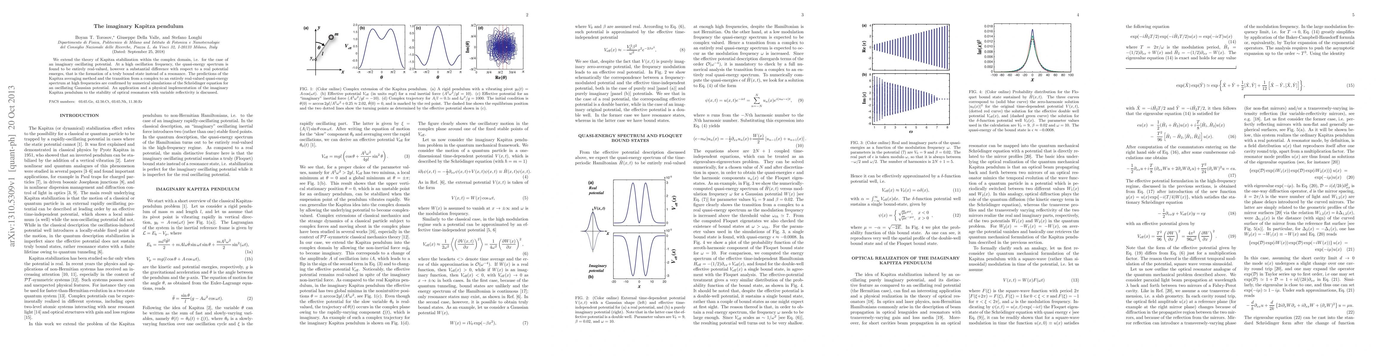 This research extends the Kapitza stabilization theory to imaginary oscillating potentials, finding real quasi-energy spectra at high frequencies and a bound state instead of a resonance. Numerical simulations confirm these predictions for an oscillating Gaussian potential, with applications to optical resonator stability.