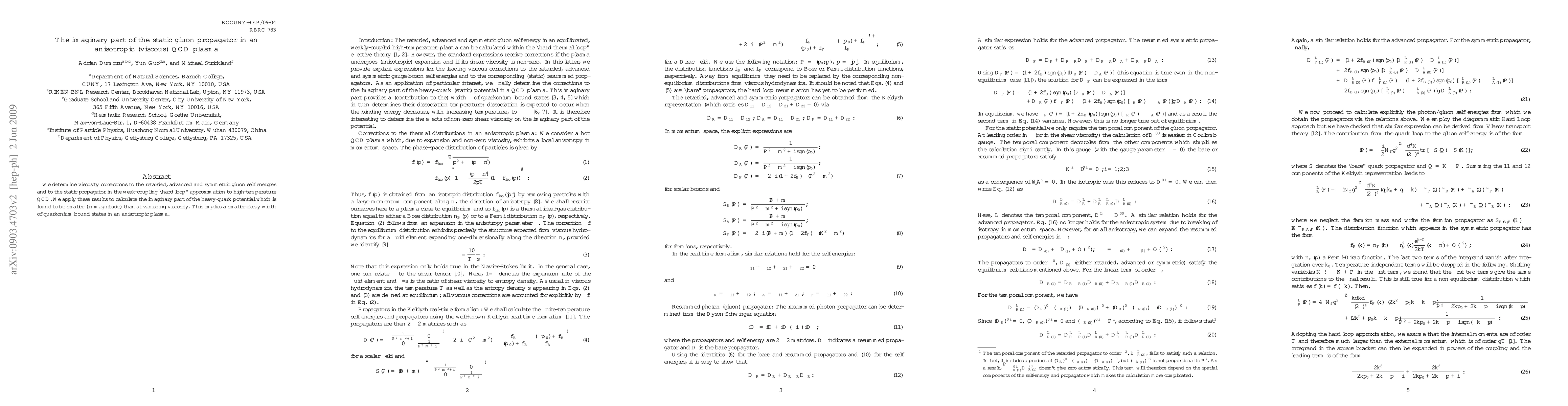 We determine viscosity corrections to the retarded, advanced and symmetric gluon self energies and to the static propagator in the weak-coupling "hard loop" approximation to high-temperature QCD. We apply these results to calculate the imaginary part of the heavy-quark potential which is found to be smaller (in magnitude) than at vanishing viscosity. This implies a smaller decay width of quarkonium bound states in an anisotropic plasma.