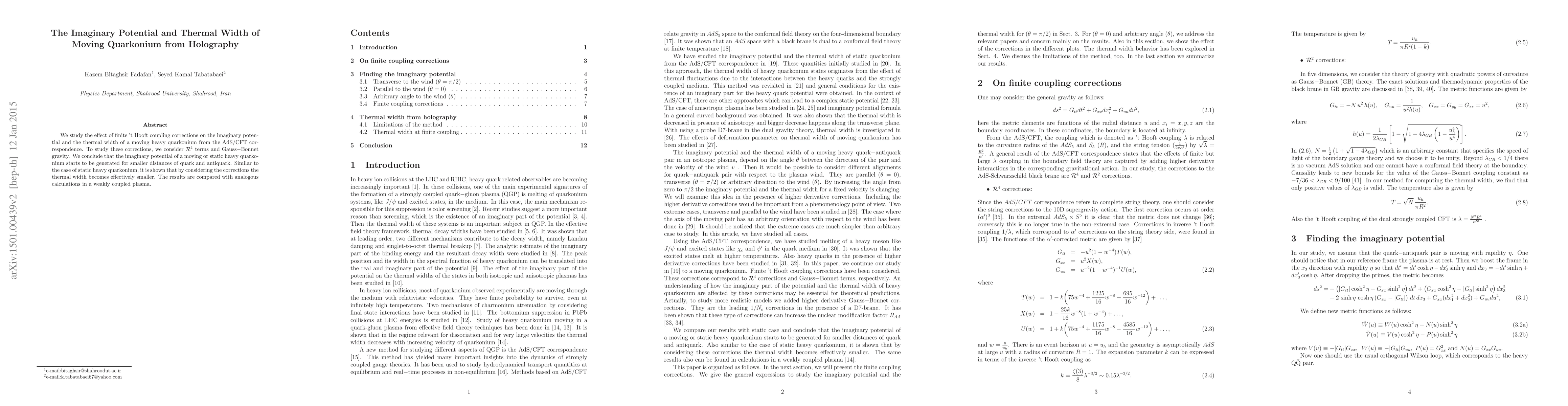 We study the effect of finite 't Hooft coupling corrections on the imaginary potential and the thermal width of a moving heavy quarkonium from the AdS/CFT correspondence. To study these corrections, we consider $\mathcal{R}^4$ terms and Gauss$-$Bonnet gravity. We conclude that the imaginary potential of a moving or static heavy quarkonium starts to be generated for smaller distances of quark and antiquark. Similar to the case of static heavy quarkonium, it is shown that by considering the corrections the thermal width becomes effectively smaller. The results are compared with analogous calculations in a weakly coupled plasma.