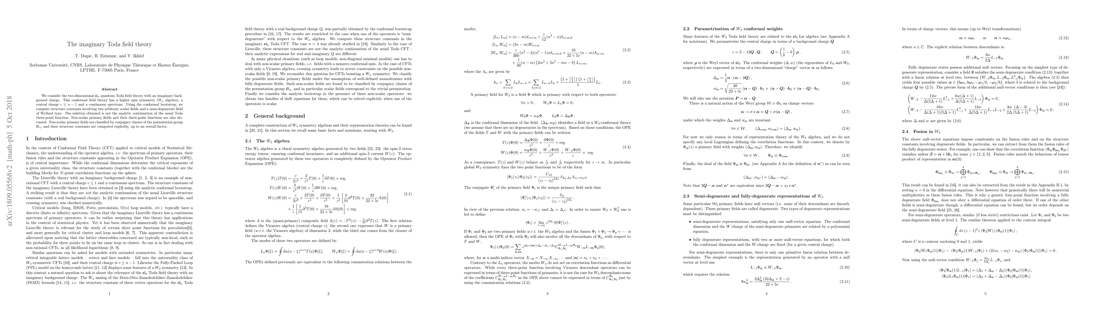 We consider the two-dimensional $\mathfrak{sl}_n$ quantum Toda field theory with an imaginary background charge. This conformal field theory has a higher spin symmetry ($W_n$ algebra), a central charge $c \leq n-1$ and a continuous spectrum. Using the conformal bootstrap, we compute structure constants involving two arbitrary scalar fields and a semi-degenerate field of Wyllard type. The solution obtained is not the analytic continuation of the usual Toda three-point function. Non-scalar primary fields and their three-point functions are also discussed. Non-scalar primary fields are classified by conjugacy classes of the permutation group $\mathfrak{S}_n$, and their structure constants are computed explicitly, up to an overall factor.