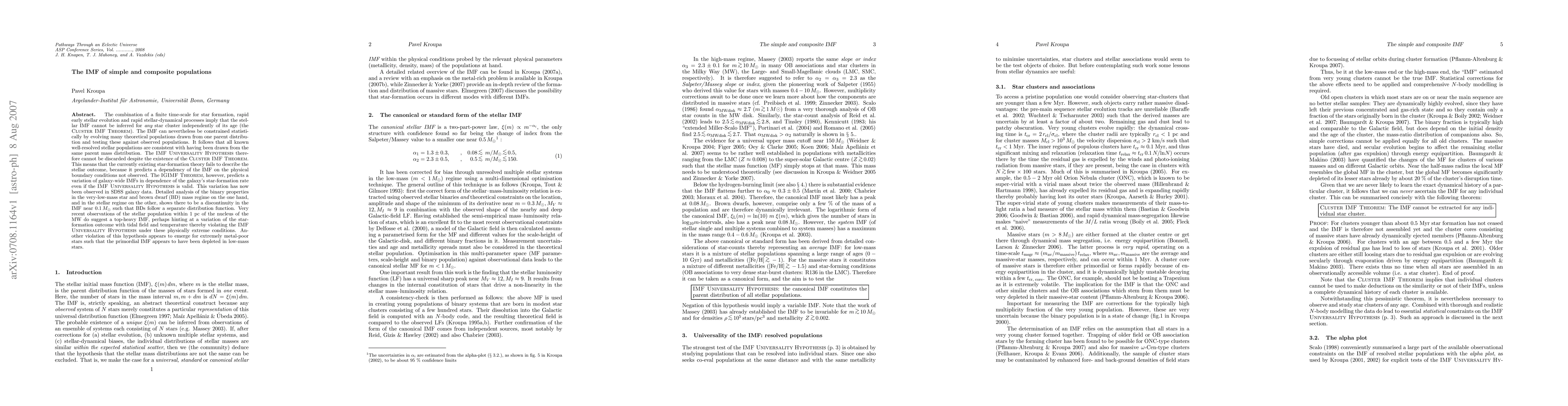 The combination of a finite time-scale for star formation, rapid early stellar evolution and rapid stellar-dynamical processes imply that the stellar IMF cannot be inferred for any star cluster independently of its age (the Cluster IMF Theorem). The IMF can nevertheless be constrained statistically by evolving many theoretical populations drawn from one parent distribution and testing these against observed populations. It follows that all known well-resolved stellar populations are consistent with having been drawn from the same parent mass distribution. The IMF Universality Hypothesis therefore cannot be discarded despite the existence of the Cluster IMF Theorem. This means that the currently existing star-formation theory fails to describe the stellar outcome, because it predicts a dependency of the IMF on the physical boundary conditions not observed. The IGIMF Theorem, however, predicts a variation of galaxy-wide IMFs in dependence of the galaxy's star-formation rate even if the IMF Universality Hypothesis is valid. This variation has now been observed in SDSS galaxy data. Detailed analysis of the binary properties in the very-low-mass star and brown dwarf (BD) mass regime on the one hand, and in the stellar regime on the other, shows there to be a discontinuity in the IMF near 0.1Msun such that BDs follow a separate distribution function. Very recent observations of the stellar population within 1pc of the nucleus of the MW do suggest a top-heavy IMF, perhaps hinting at a variation of the star-formation outcome with tidal field and temperature thereby violating the IMF Universality Hypothesis under these physically extreme conditions. Another violation of this hypothesis appears to emerge for extremely metal-poor stars such that the primordial IMF appears to have been depleted in low-mass stars.