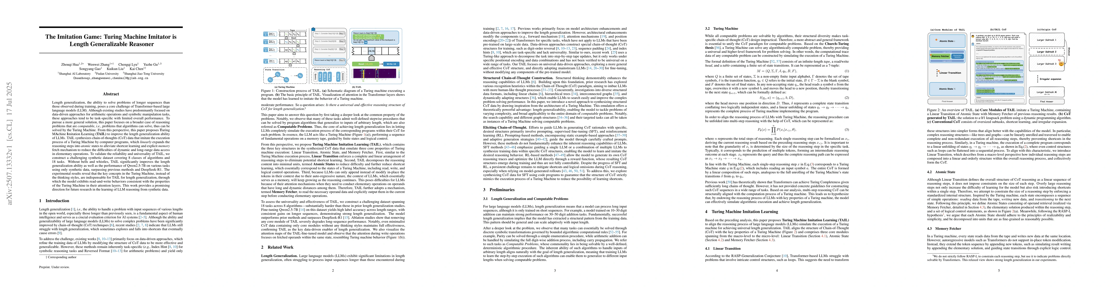 Length generalization, the ability to solve problems of longer sequences than those observed during training, poses a core challenge of Transformer-based large language models (LLM). Although existing studies have predominantly focused on data-driven approaches for arithmetic operations and symbolic manipulation tasks, these approaches tend to be task-specific with limited overall performance. To pursue a more general solution, this paper focuses on a broader case of reasoning problems that are computable, i.e., problems that algorithms can solve, thus can be solved by the Turing Machine. From this perspective, this paper proposes Turing MAchine Imitation Learning (TAIL) to improve the length generalization ability of LLMs. TAIL synthesizes chain-of-thoughts (CoT) data that imitate the execution process of a Turing Machine by computer programs, which linearly expands the reasoning steps into atomic states to alleviate shortcut learning and explicit memory fetch mechanism to reduce the difficulties of dynamic and long-range data access in elementary operations. To validate the reliability and universality of TAIL, we construct a challenging synthetic dataset covering 8 classes of algorithms and 18 tasks. Without bells and whistles, TAIL significantly improves the length generalization ability as well as the performance of Qwen2.5-7B on various tasks using only synthetic data, surpassing previous methods and DeepSeek-R1. The experimental results reveal that the key concepts in the Turing Machine, instead of the thinking styles, are indispensable for TAIL for length generalization, through which the model exhibits read-and-write behaviors consistent with the properties of the Turing Machine in their attention layers. This work provides a promising direction for future research in the learning of LLM reasoning from synthetic data.
