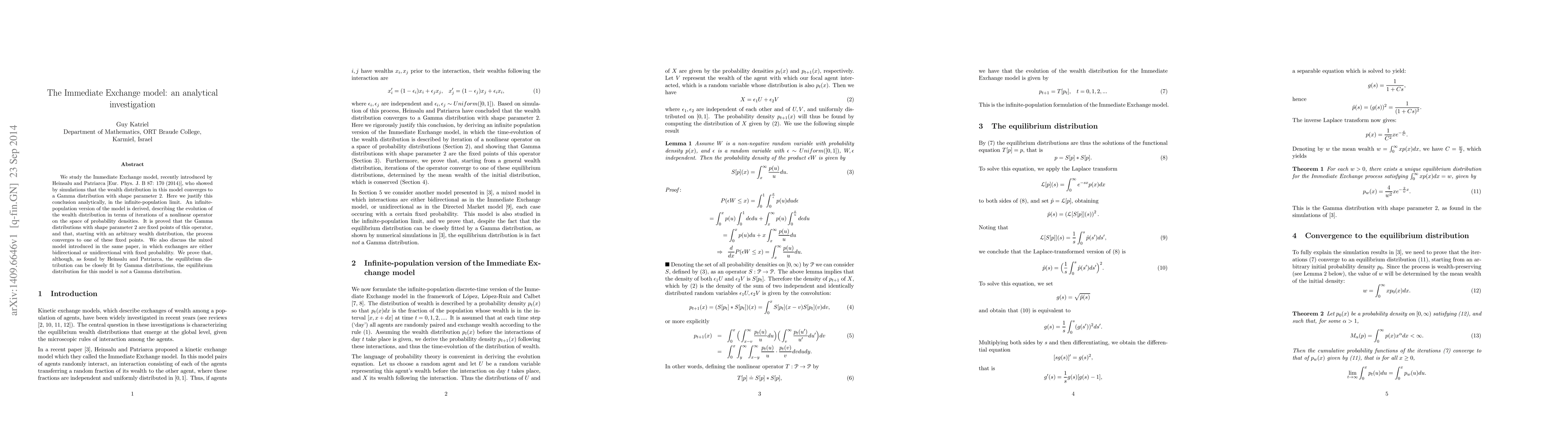 We study the Immediate Exchange model, recently introduced by Heinsalu and Patriarca [Eur. Phys. J. B 87: 170 (2014)], who showed by simulations that the wealth distribution in this model converges to a Gamma distribution with shape parameter $2$. Here we justify this conclusion analytically, in the infinite-population limit. An infinite-population version of the model is derived, describing the evolution of the wealth distribution in terms of iterations of a nonlinear operator on the space of probability densities. It is proved that the Gamma distributions with shape parameter $2$ are fixed points of this operator, and that, starting with an arbitrary wealth distribution, the process converges to one of these fixed points. We also discuss the mixed model introduced in the same paper, in which exchanges are either bidirectional or unidirectional with fixed probability. We prove that, although, as found by Heinsalu and Patriarca, the equilibrium distribution can be closely fit by Gamma distributions, the equilibrium distribution for this model is {\it{not}} a Gamma distribution.