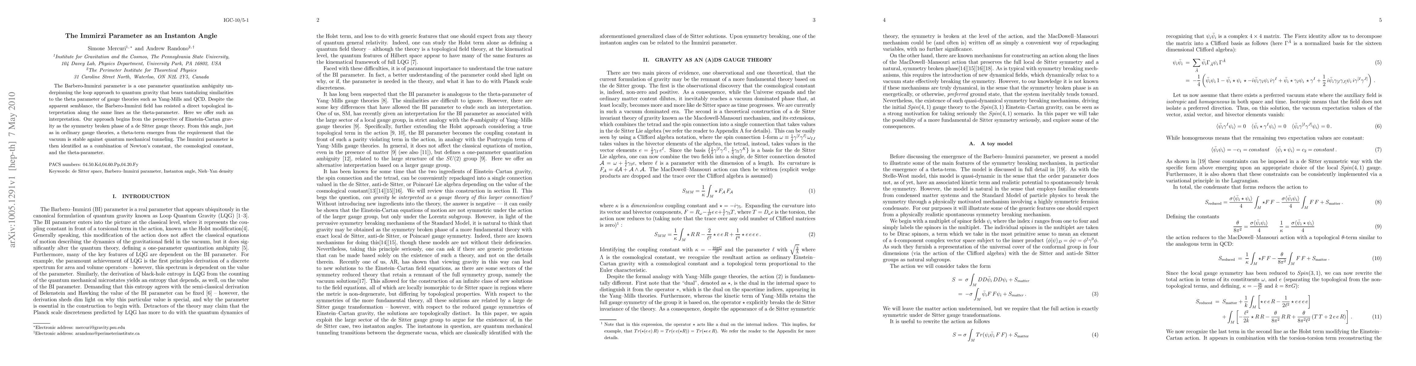 The paper interprets the Barbero-Immirzi parameter as an instanton angle akin to the theta parameter in gauge theories, showing that it emerges from stability requirements in the quantum vacuum within the framework of Einstein-Cartan gravity viewed as a symmetry-broken de Sitter gauge theory. The Immirzi parameter is identified as a combination of Newton's constant, the cosmological constant, and the theta-parameter.