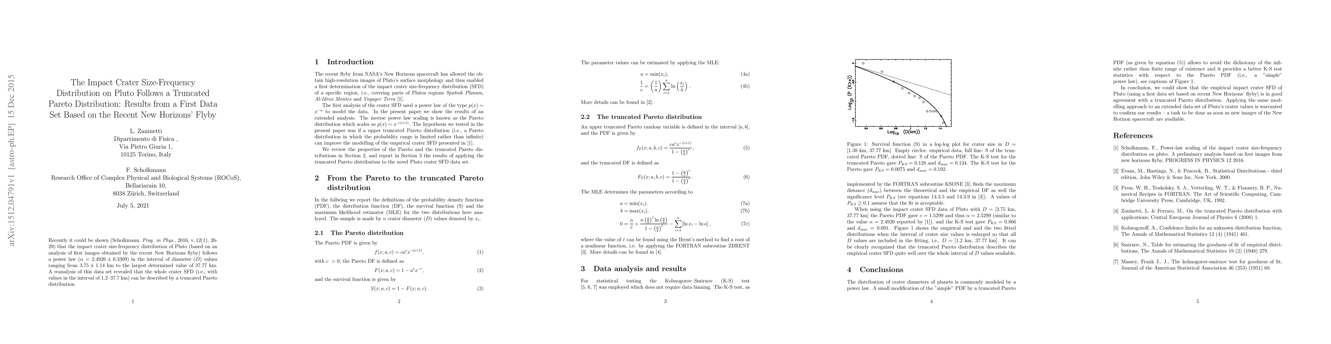 Recently it could be shown ( that the impact crater size-frequency distribution of Pluto (based on an analysis of first images obtained by the recent New Horizons flyby) follows a power law alpha = 2.4926 in the interval of diameter (D) values ranging from 3.75 km to the largest determined value of 37.77 km. A reanalysis of this data set revealed that the whole crater SFD (i.e., with values in the interval of 1.2-37.7 km) can be described by a truncated Pareto distribution.