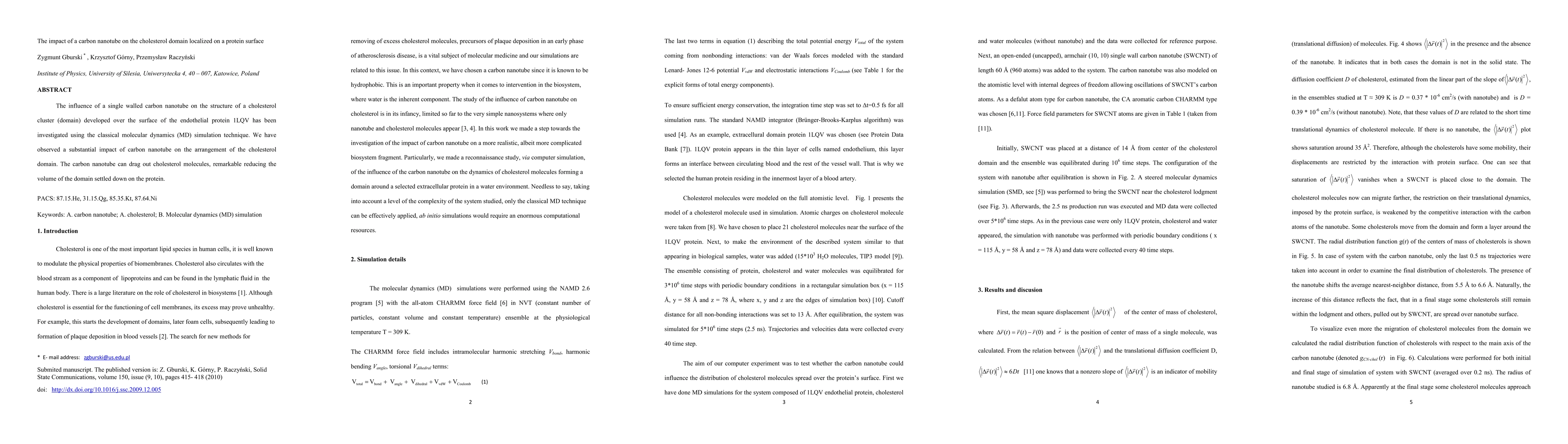 Summary: This study investigates the effect of a single-walled carbon nanotube on a cholesterol domain on the surface of endothelial protein 1LQV using classical molecular dynamics simulations. The results show that the carbon nanotube significantly alters the cholesterol domain's structure by dragging out cholesterol molecules, thereby reducing the domain's volume.