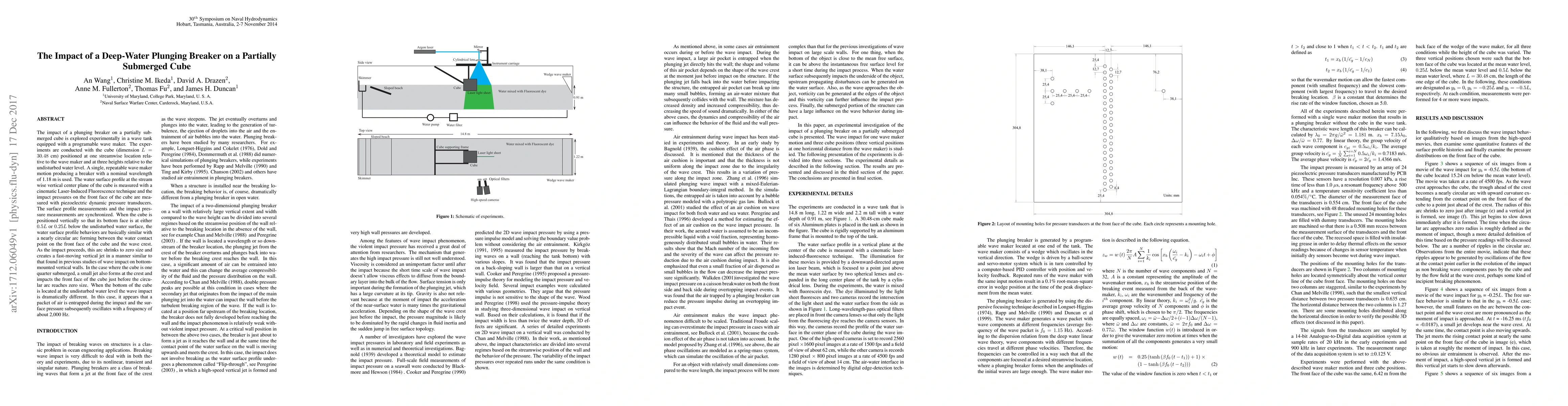 This study experimentally investigates the impact of a deep-water plunging breaker on a partially submerged cube using synchronized surface profile and pressure measurements. The results show that when the cube is partially submerged, a circular arc forms and collapses to create a vertical jet, while at the water level, air entrapment leads to high-frequency oscillations in surface pressure.