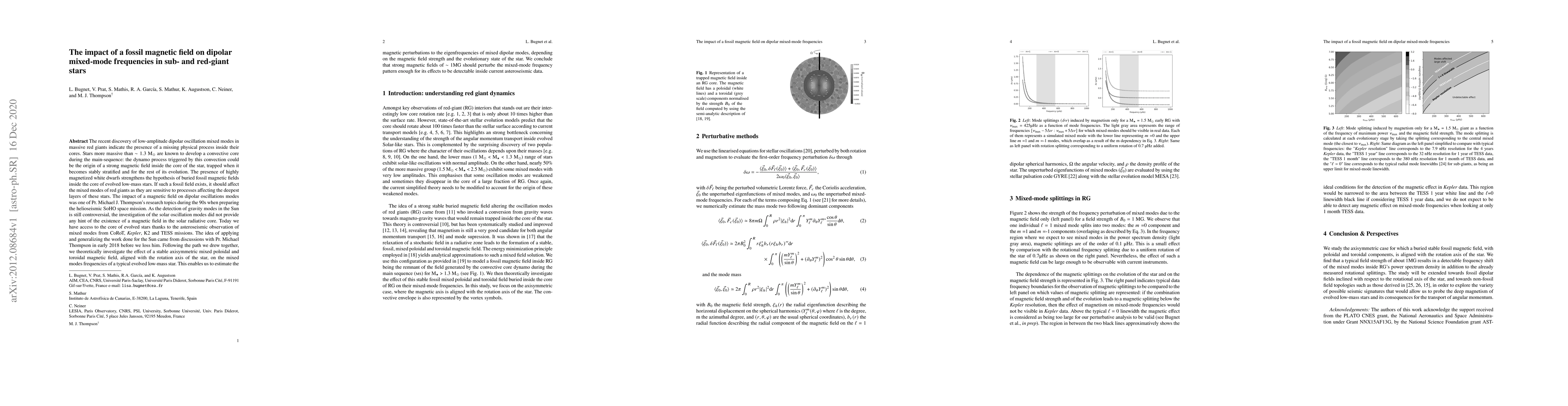 Stars more massive than $\sim 1.3$ M$_\odot$ are known to develop a convective core during the main-sequence: the dynamo process triggered by this convection could be the origin of a strong magnetic field inside the core of the star, trapped when it becomes stably stratified and for the rest of its evolution. The presence of highly magnetized white dwarfs strengthens the hypothesis of buried fossil magnetic fields inside the core of evolved low-mass stars. If such a fossil field exists, it should affect the mixed modes of red giants as they are sensitive to processes affecting the deepest layers of these stars. The impact of a magnetic field on dipolar oscillations modes was one of Pr. Michael J. Thompson's research topics during the 90s when preparing the helioseismic SoHO space mission. As the detection of gravity modes in the Sun is still controversial, the investigation of the solar oscillation modes did not provide any hint of the existence of a magnetic field in the solar radiative core. Today we have access to the core of evolved stars thanks to the asteroseismic observation of mixed modes from CoRoT, Kepler, K2 and TESS missions. The idea of applying and generalizing the work done for the Sun came from discussions with Pr. Michael Thompson in early 2018 before we loss him. Following the path we drew together, we theoretically investigate the effect of a stable axisymmetric mixed poloidal and toroidal magnetic field, aligned with the rotation axis of the star, on the mixed modes frequencies of a typical evolved low-mass star. This enables us to estimate the magnetic perturbations to the eigenfrequencies of mixed dipolar modes, depending on the magnetic field strength and the evolutionary state of the star. We conclude that strong magnetic fields of $\sim$ 1MG should perturbe the mixed-mode frequency pattern enough for its effects to be detectable inside current asteroseismic data.