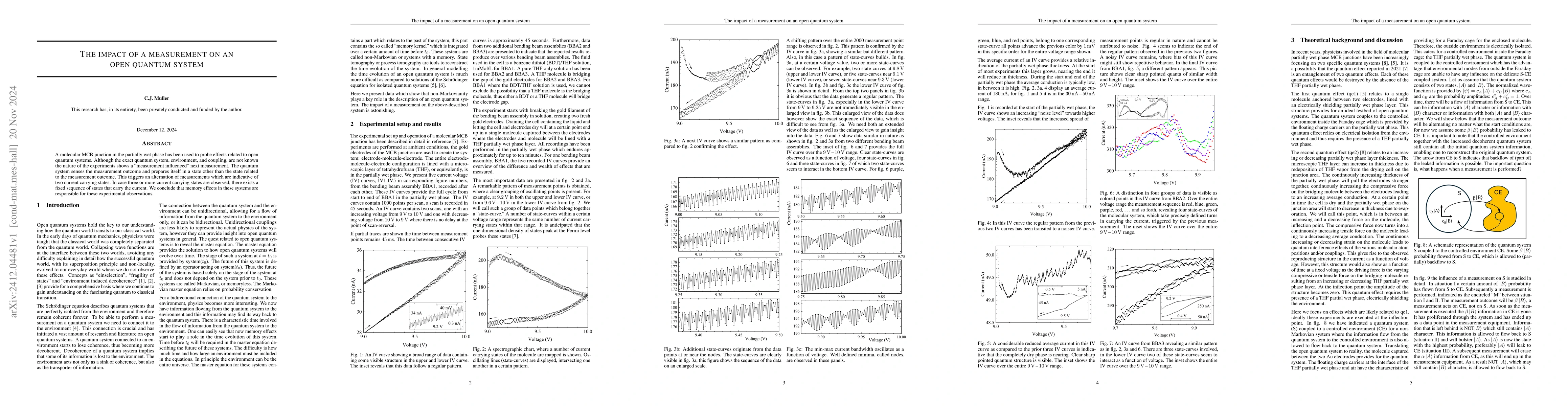 The study investigates a molecular MCB junction in a partially wet phase to explore the influence of measurement on open quantum systems, revealing that measurement outcomes affect subsequent measurements, leading to distinct current-carrying states and suggesting memory effects underpin these observations.