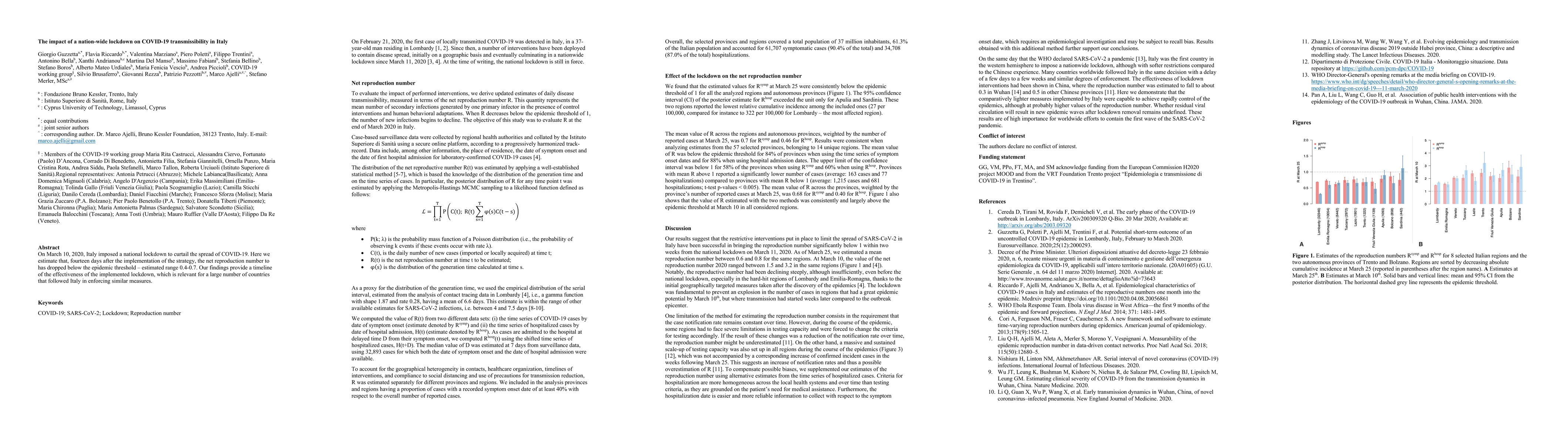 Summary: Italy's national lockdown implemented on March 10, 2020, significantly reduced COVID-19 transmissibility, with the net reproduction number dropping below 1 within two weeks, indicating the strategy's effectiveness and relevance for similar measures worldwide.