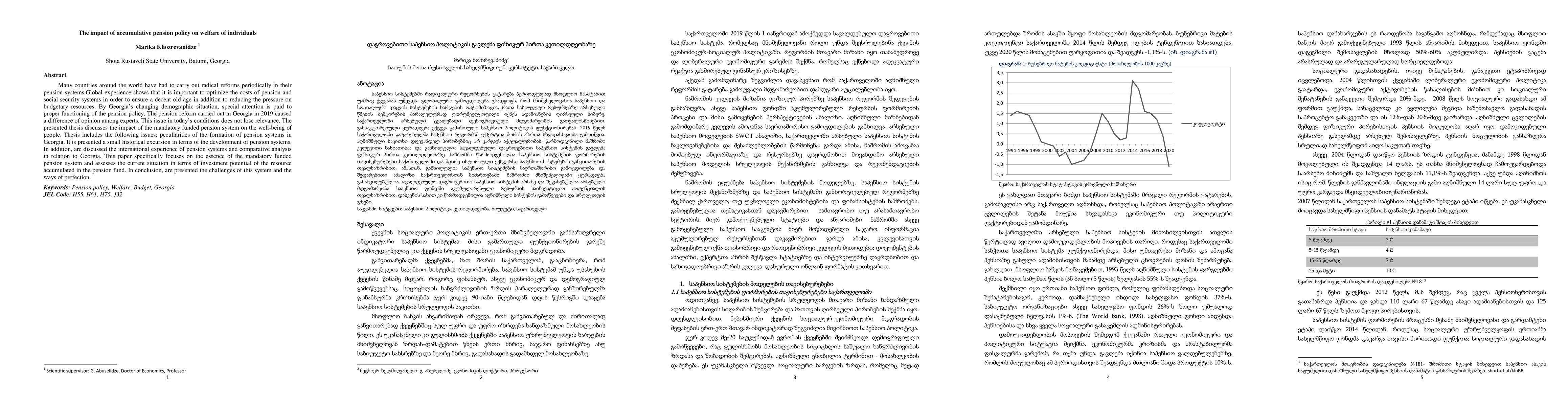 Many countries around the world have had to carry out radical reforms periodically in their pension systems. Global experience shows that it is important to optimize the costs of pension and social security systems in order to ensure a decent old age in addition to reducing the pressure on budgetary resources. By Georgia is changing demographic situation, special attention is paid to proper functioning of the pension policy. The pension reform carried out in Georgia in 2019 caused a difference of opinion among experts. This issue in today is conditions does not lose relevance. The presented thesis discusses the impact of the mandatory funded pension system on the well-being of people. Thesis includes the following issues: peculiarities of the formation of pension systems in Georgia. It is presented a small historical excursion in terms of the development of pension systems. In addition, are discussed the international experience of pension systems and comparative analysis in relation to Georgia. This paper specifically focuses on the essence of the mandatory funded pension system and assesses the current situation in terms of investment potential of the resource accumulated in the pension fund. In conclusion, are presented the challenges of this system and the ways of perfection.