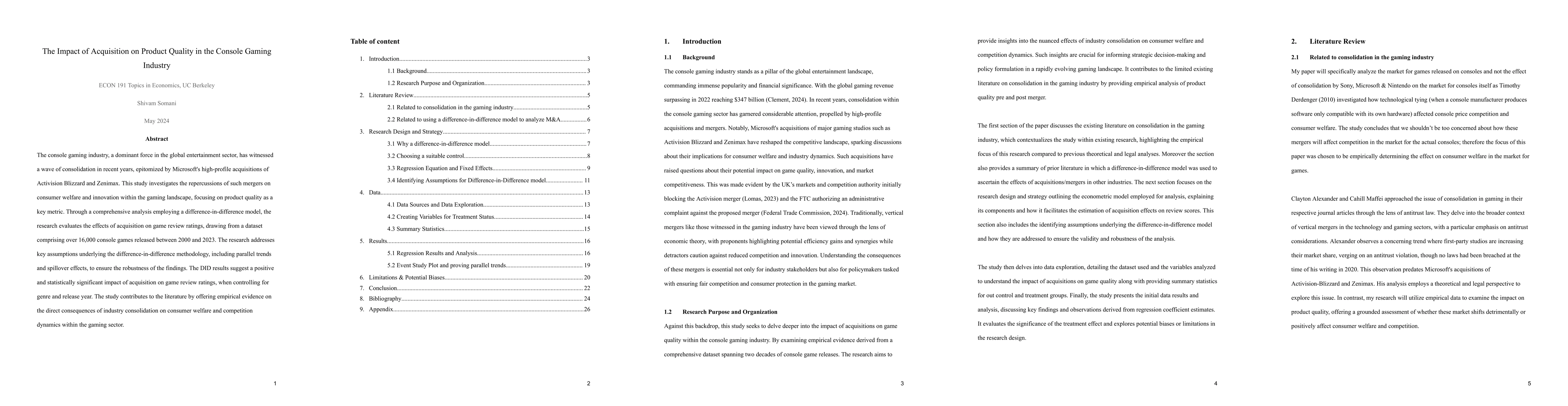 This study analyzes the impact of high-profile acquisitions in the console gaming industry on product quality, finding a positive and significant effect on game review ratings post-acquisition. The research employs a difference-in-difference model to assess changes in game quality, contributing empirical insights on industry consolidation's influence on consumer welfare and innovation.