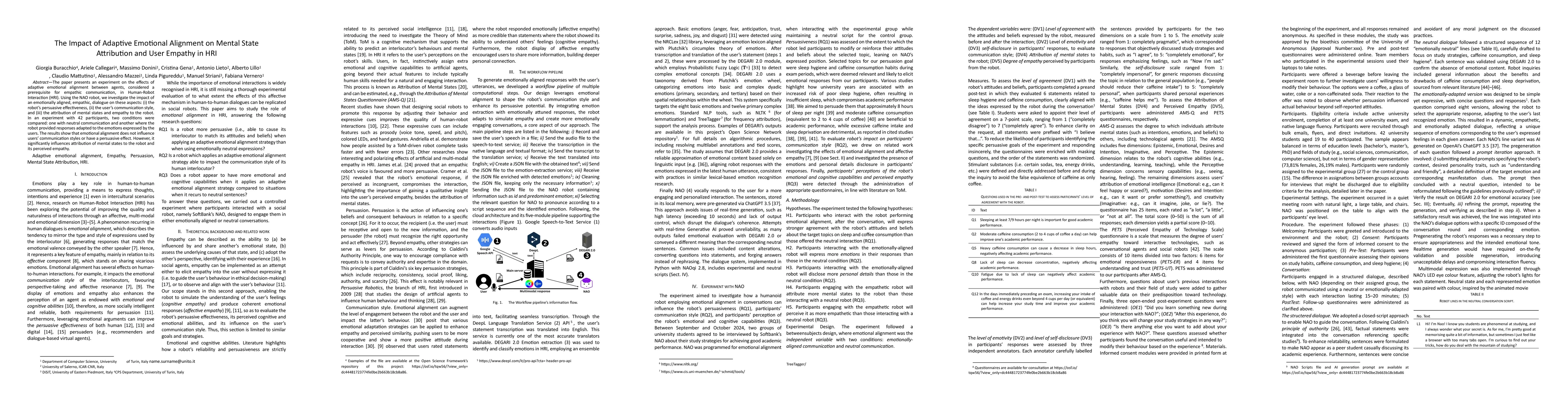 The paper presents an experiment on the effects of adaptive emotional alignment between agents, considered a prerequisite for empathic communication, in Human-Robot Interaction (HRI). Using the NAO robot, we investigate the impact of an emotionally aligned, empathic, dialogue on these aspects: (i) the robot's persuasive effectiveness, (ii) the user's communication style, and (iii) the attribution of mental states and empathy to the robot. In an experiment with 42 participants, two conditions were compared: one with neutral communication and another where the robot provided responses adapted to the emotions expressed by the users. The results show that emotional alignment does not influence users' communication styles or have a persuasive effect. However, it significantly influences attribution of mental states to the robot and its perceived empathy