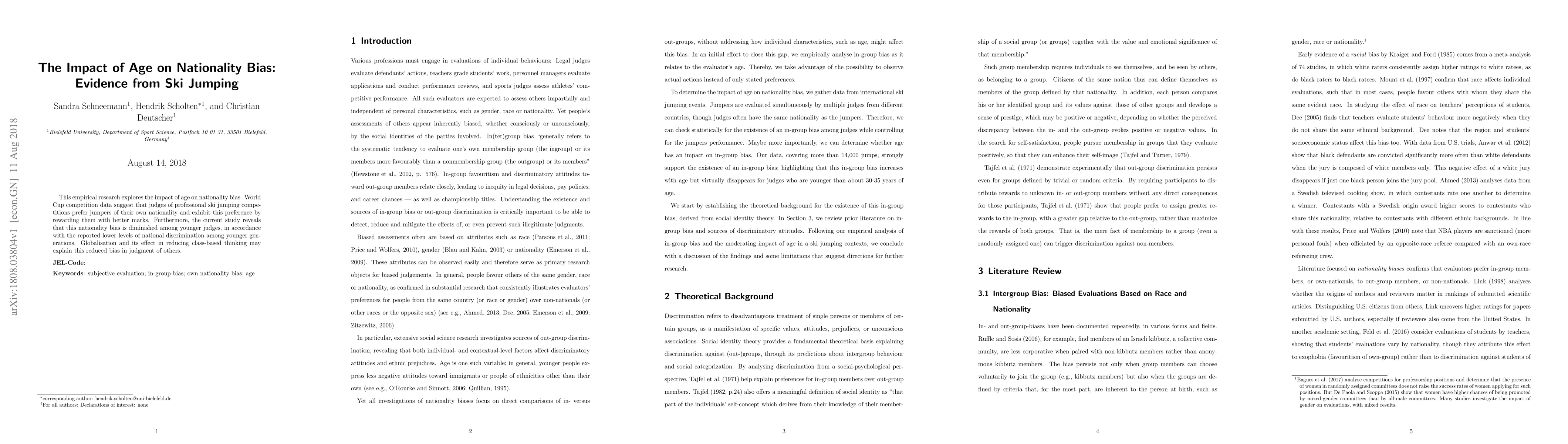 This empirical research explores the impact of age on nationality bias. World Cup competition data suggest that judges of professional ski jumping competitions prefer jumpers of their own nationality and exhibit this preference by rewarding them with better marks. Furthermore, the current study reveals that this nationality bias is diminished among younger judges, in accordance with the reported lower levels of national discrimination among younger generations. Globalisation and its effect in reducing class-based thinking may explain this reduced bias in judgment of others.