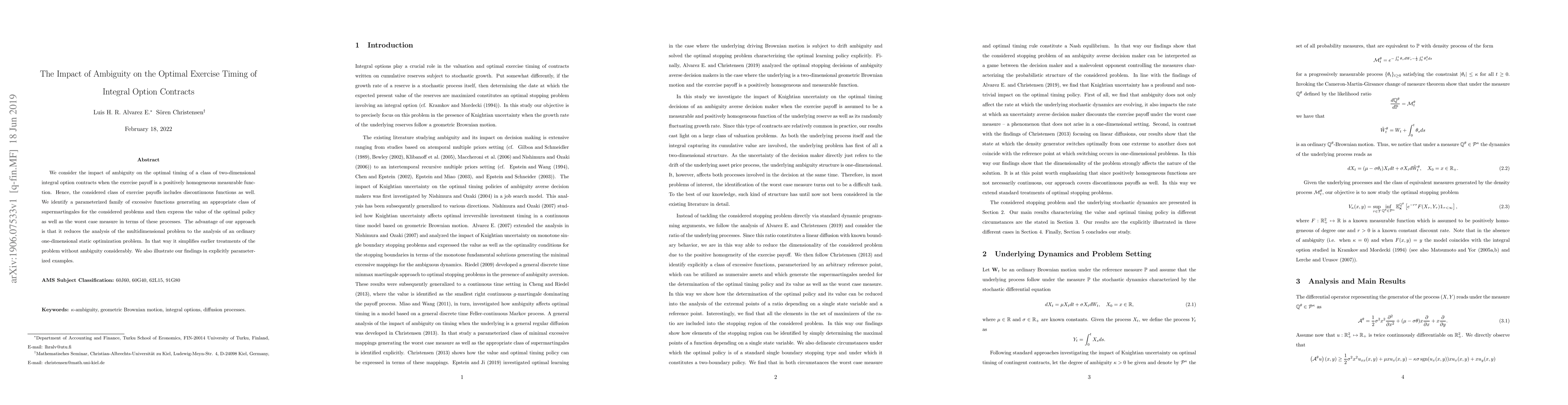 We consider the impact of ambiguity on the optimal timing of a class of two-dimensional integral option contracts when the exercise payoff is a positively homogeneous measurable function. Hence, the considered class of exercise payoffs includes discontinuous functions as well. We identify a parameterized family of excessive functions generating an appropriate class of supermartingales for the considered problems and then express the value of the optimal policy as well as the worst case measure in terms of these processes. The advantage of our approach is that it reduces the analysis of the multidimensional problem to the analysis of an ordinary one-dimensional static optimization problem. In that way it simplifies earlier treatments of the problem without ambiguity considerably. We also illustrate our findings in explicitly parameterized examples.