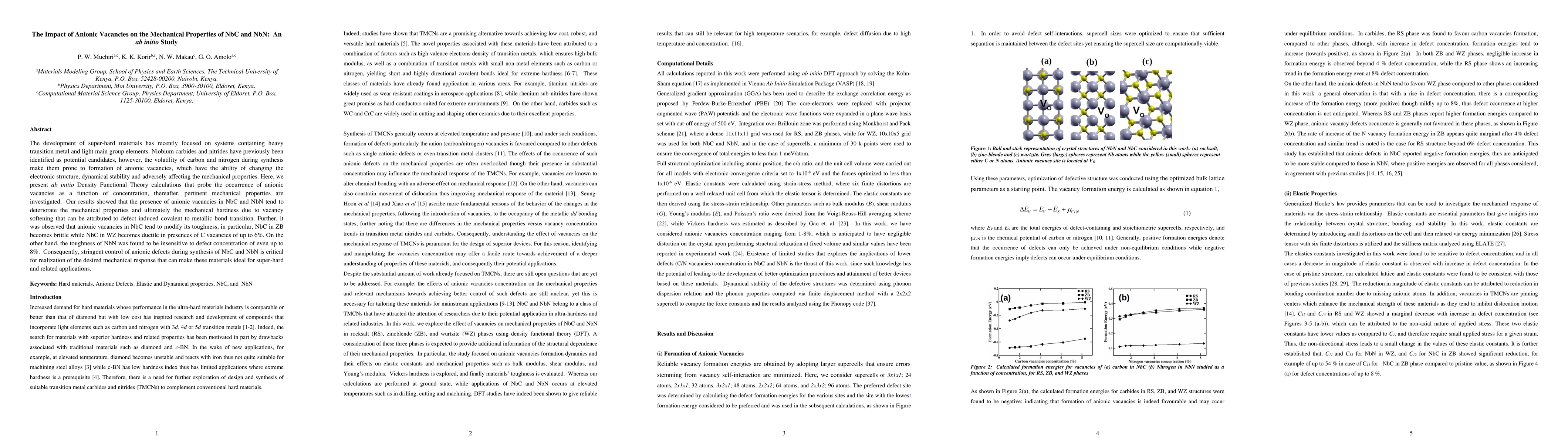 This study uses ab initio Density Functional Theory to investigate how anionic vacancies affect the mechanical properties of NbC and NbN. The results show that vacancies deteriorate mechanical hardness and toughness, with NbC becoming brittle in zinc blende structure and ductile in the wurtzite structure due to vacancy-induced bond transitions.