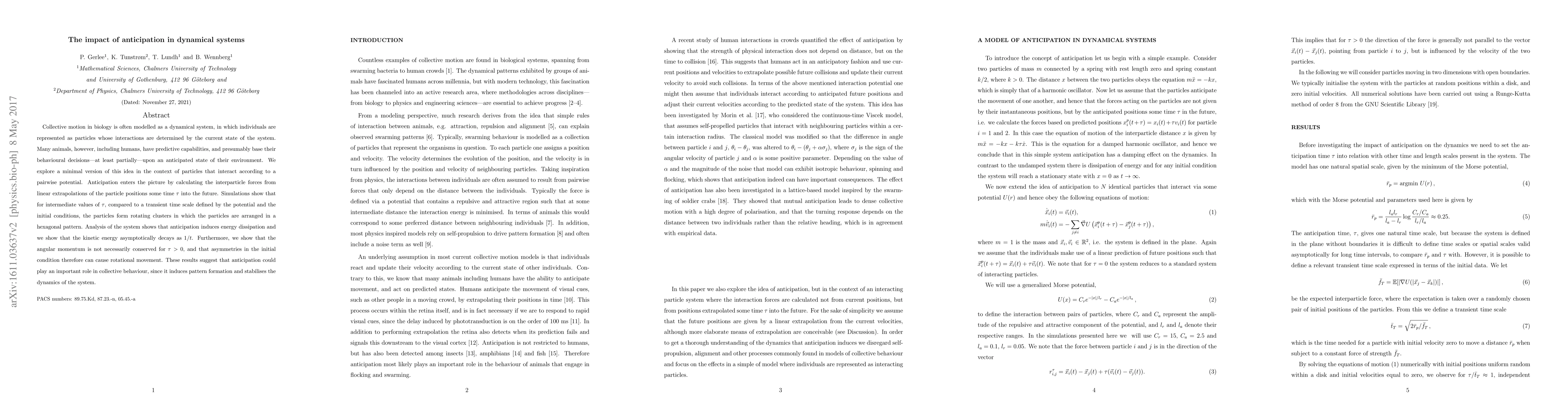 Collective motion in biology is often modelled as a dynamical system, in which individuals are represented as particles whose interactions are determined by the current state of the system. Many animals, however, including humans, have predictive capabilities, and presumably base their behavioural decisions---at least partially---upon an anticipated state of their environment. We explore a minimal version of this idea in the context of particles that interact according to a pairwise potential. Anticipation enters the picture by calculating the interparticle forces from linear extrapolations of the particle positions some time $\tau$ into the future. Simulations show that for intermediate values of $\tau$, compared to a transient time scale defined by the potential and the initial conditions, the particles form rotating clusters in which the particles are arranged in a hexagonal pattern. Analysis of the system shows that anticipation induces energy dissipation and we show that the kinetic energy asymptotically decays as $1/t$. Furthermore, we show that the angular momentum is not necessarily conserved for $\tau >0$, and that asymmetries in the initial condition therefore can cause rotational movement. These results suggest that anticipation could play an important role in collective behaviour, since it induces pattern formation and stabilises the dynamics of the system.