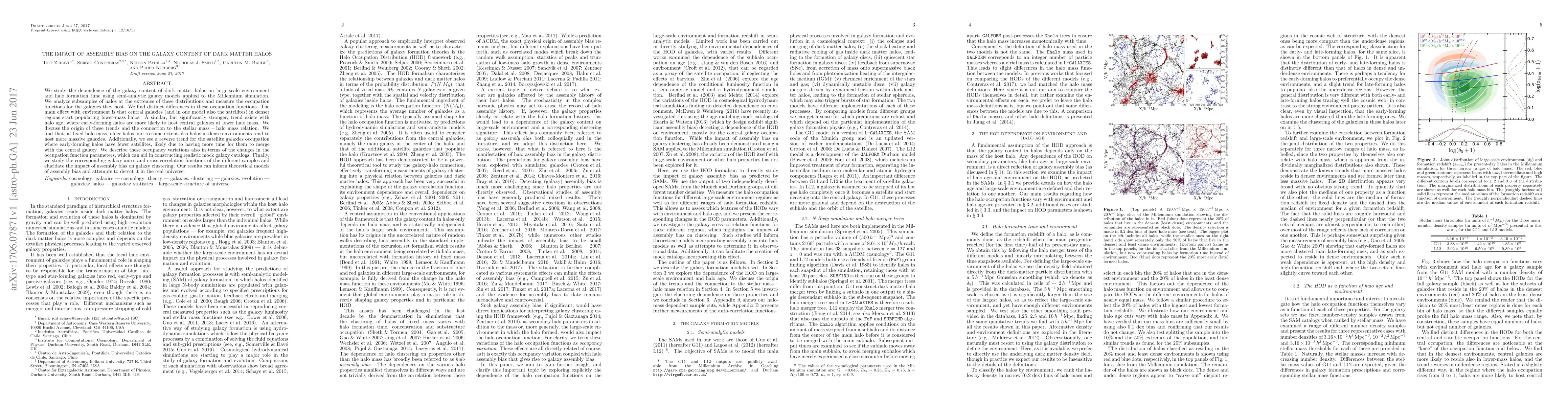 This paper investigates the galaxy content of dark matter halos in relation to their large-scale environment and formation time, revealing that denser environments and earlier halo formation lead to distinct galaxy occupation functions. Specifically, older halos and those in dense regions tend to host more massive central galaxies, while early-forming halos have fewer satellite galaxies due to mergers.