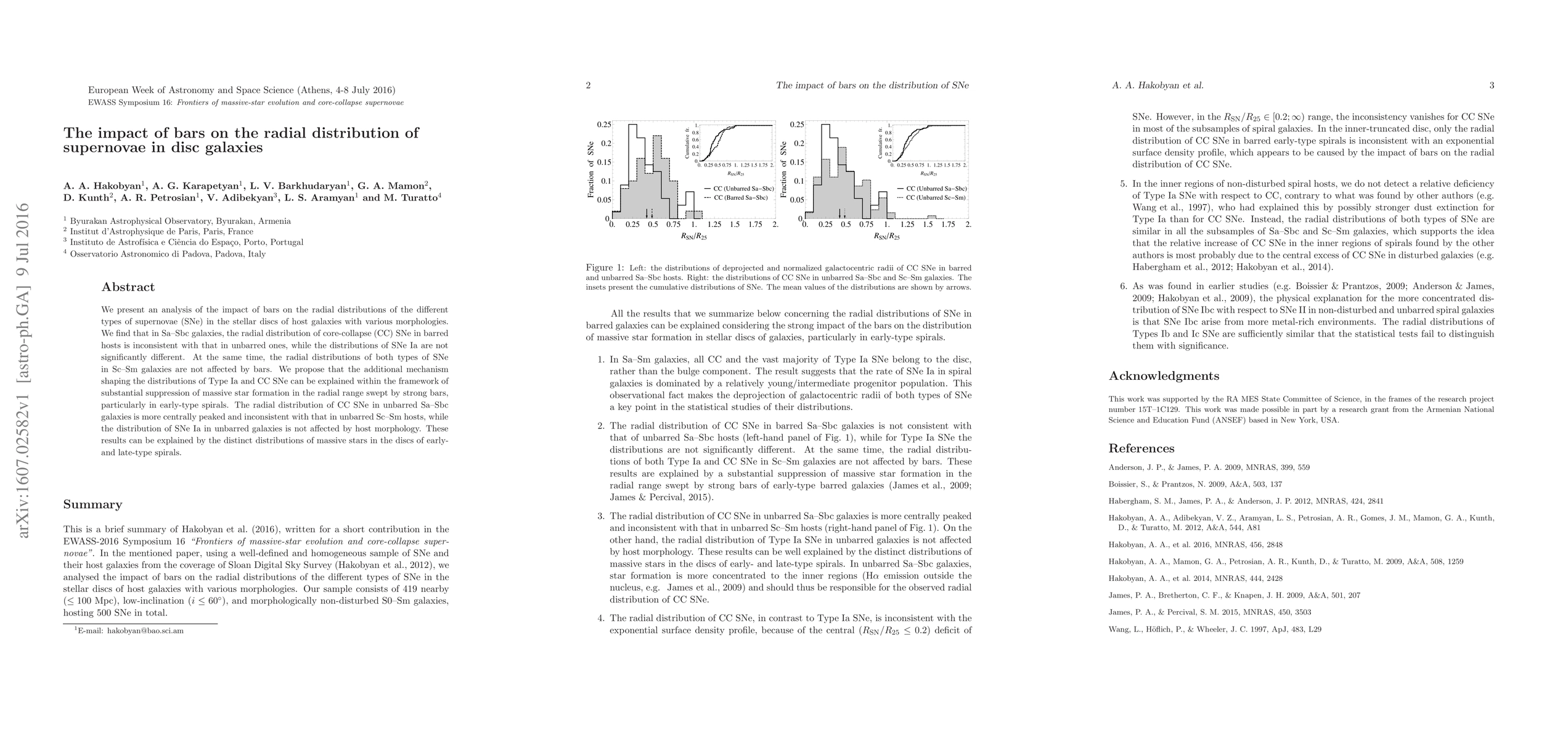 This study investigates how bars in disc galaxies influence the radial distribution of different supernovae types. It finds that in Sa-Sbc galaxies, core-collapse supernovae are more centrally concentrated in barred systems, while Type Ia supernovae are unaffected. In contrast, bars do not significantly alter supernova distributions in Sc-Sm galaxies.